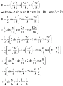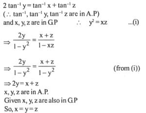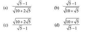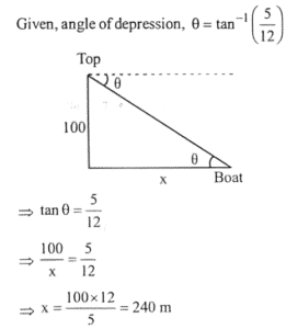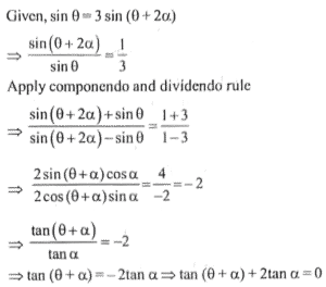 (Mathematics) NDA/NA Solved Paper 2017-ITotal Questions: 5041. From the top of a lighthouse, 100 m high, the angle of depression of a boat is tan⁻¹ (5/12). What is the distance between the boat and the lighthouse?(a) 120m(b) 180m(c) 240m(d) 360 mCorrect Answer: (c) 240mSolution:42. Solve the following question:(a) π/12(b) π/6(c) π/3(d) π/2Correct Answer: (a) π/12Solution:43. Solve the following question:(a) 1/2(b) 1/4(c) 1/8(d) 1/16Correct Answer: (c) 1/8Solution:44. Solve the following question: (a)(b)(c)(d)Correct Answer: (a)Solution:45. If sinθ = 3 sin (θ+ 2α), then the value of tan (θ+ α) + 2 tan α is equal to(a) -1(b) 0(c) 1(d) 2Correct Answer: (b) 0Solution:46. What is the value of tan 18°?(a)(b)(c)(d)Correct Answer: (a)Solution:47. Let x, y, z be positive real numbers such that x, y,zare in GP and tan⁻¹x, tan⁻¹y and tan⁻¹z are in AP. Then which one of the following is correct?(a) x=y=z(b) xz = 1(c) x ≠ y and y = z(d) x = y and y ≠ zCorrect Answer: (a) x=y=zSolution:48. If tan (α + β) = 2 and tan (α - β) = 1, then tan (2α) is equal to (a) -3(b) -2(c) -(1/3)(d) 1Correct Answer: (a) -3Solution:49. Consider the following for triangle ABC: Which of the above are correct?(a) 1 and 3(b) 1 and 2(c) 1 and 4(d) 2 and 3Correct Answer: (b) 1 and 2Solution:50. If secθ - cosecθ = 4/3, then what is (sinθ - cosθ) equal to ?(a) -2 only(b) 1/2 only(c) Both-2 and 1/2(d) Neither 1/2 nor -2Correct Answer: (b) 1/2 onlySolution: Submit Quiz« Previous12345
