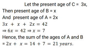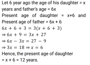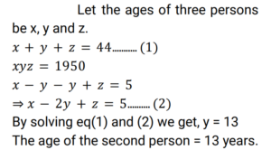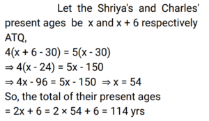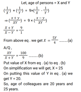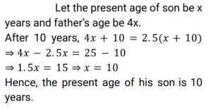 Age (Railway Maths) (Part – I)Total Questions: 5011. A father is four times as old as his son. After 10 years the father's age will be 2.5 times that of his son. Find the son's present age. [Group D 19/09/2022 (Afternoon)](a) 60 years(b) 40 years(c) 10 years(d) 15 yearsCorrect Answer: (c) 10 yearsSolution:12. The sum of the ages of three persons is 44 years and the numerical product of their ages is 1950. Also, the difference in the ages of the second and the third person, when subtracted from the difference in the ages of the first and the second person, is 5 years. Find the present age of the second person. [Group D 26/09/2022 (Morning)](a) 10 years(b) 6 years(c) 13 years(d) 25 yearsCorrect Answer: (c) 13 yearsSolution:13. The ages of Mahender and Zahid are in the ratio 6 : 7. Fifteen years ago their ages were in the ratio 9 : 11. Mahender's present age is: [NTPC CBT-1 10/01/2021 (Morning)](a) 18 years(b) 54 years(c) 60 years(d) 10 yearsCorrect Answer: (c) 60 yearsSolution:14. Aman's great-grandfather is 105 years old. Aman's father Ram Singh's age is 1/3 of his grandfather. Five years ago, when Aman was born, Ram Singh's mother was double the age of Ram Singh. What is the difference of age between Aman and Ram Singh? [NTPC CBT-1 13/01/2021 (Morning)](a) 20 years(b) 25 years(c) 35 years(d) 30 yearsCorrect Answer: (d) 30 yearsSolution:15. The sum of the reciprocals of the ages of two colleagues is nine times the difference of the reciprocals of their ages. If the ratio of the products of their ages to the sum of their ages is 100 : 9. Find their ages? [NTPC CBT-1 30/01/2021 (Evening)](a) 20 years, 25 years(b) 15 years, 10 years(c) 24 years, 45 years(d) 25 years, 4 yearsCorrect Answer: (a) 20 years, 25 yearsSolution:16. In a family, the father's age is 5 times the age of one of his sons. Mother's age is 4 times the age of their other son. Difference in the parents' ages is half the sum of the sons' ages. Then: [RRB JE 02/06/2019 (Evening) ](a) They are twins(b) The difference in their ages is 5(c) One son is twice as old as the other(d) The sum of their ages is a multiple of 5Correct Answer: (a) They are twinsSolution:17. The difference between Charles' and Shriya's ages is 6 years. When they married each other 30 years ago, 4 times Charles's age was the same as 5 times the age of Shriya. What is the total of their present ages ? [RRB ALP Tier - I 10/08/2018 (Evening) ](a) 114 years(b) 110 years(c) 115 years(d) 112 yearsCorrect Answer: (a) 114 yearsSolution:18. A is twice as old as B. B is 1/3 as old as C. The sum of ages of A, B and C is 42 years. Find the sum of the ages of A and B. [Group D 17/08/2022 (Afternoon)](a) 12 years(b) 15 years(c) 21 years(d) 23 yearsCorrect Answer: (c) 21 yearsSolution:19. The age of a father six years ago was six times the then age of his daughter. Three years hence, the father will be thrice as old as his daughter. What is the present age of the daughter? [Group D 17/08/2022 (Evening)](a) 15 years(b) 12 years(c) 17 years(d) 20 yearsCorrect Answer: (b) 12 yearsSolution:20. Aruna has a younger sister whose age is 8 years less than that of Aruna. If Aruna's sister's age is 18 years, then Aruna's age is: [Group D 17/08/2022 (Evening)](a) 28 years(b) 26 years(c) 10 years(d) 24 yearsCorrect Answer: (b) 26 yearsSolution:Submit Quiz« Previous12345Next »