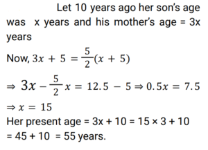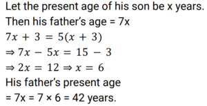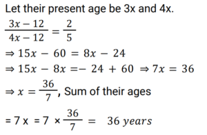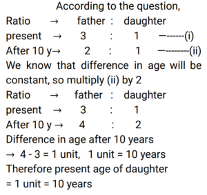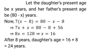 Age (Railway Maths) (Part – I)Total Questions: 5021. The present ages of Shanthi and Keerthi are in the ratio of 7 : 3. After 5 years, Shanthi's age will be 40. How old will Keerthi be after 5 years? [Group D 17/08/2022 (Evening)](a) 10 years(b) 30 years(c) 20 years(d) 15 yearsCorrect Answer: (c) 20 yearsSolution:22. The sum of the present ages of a father and his daughter is 80 years. Eight years ago, the father's age was seven times the age of his daughter. Eight years from now, what will be the daughter's age? [Group D 18/08/2022 (Evening)](a) 18 years(b) 20 years(c) 22 years(d) 24 yearsCorrect Answer: (d) 24 yearsSolution:23. Kohli is younger than Rohit by 3 years. If the ages of Kohli and Rohit are in the ratio 7:8, how old is Kohli? [Group D 22/08/2022 (Morning) ](a) 18 years(b) 27 years(c) 24 years(d) 21 yearsCorrect Answer: (d) 21 yearsSolution:24. A father is presently 3 times his daughter's age. After 10 years he will be twice as old as her. Find the daughter's present age. [Group D 22/08/2022 (Morning)](a) 15 years(b) 5 years(c) 20 years(d) 10 yearsCorrect Answer: (d) 10 yearsSolution:25. Ten years ago, a mother was 3 times as old as her son. 5 years ago she was 5/2 times her son's age. What is her present age? [Group D 23/08/2022 (Morning)](a) 30 years(b) 35 years(c) 55 years(d) 45 yearsCorrect Answer: (c) 55 yearsSolution:26. In the year 2000, Monu was 3 times his sister's age. In 2010, he was 24 years older than her. Find Monu's age in 2010. [Group D 23/08/2022 (Morning)](a) 38 years(b) 46 years(c) 52 years(d) 62 yearsCorrect Answer: (b) 46 yearsSolution:27. Rani's sister's age is 4 years more than her age. If her sister's age is 28 years, then find Rani's age. [Group D 23/08/2022 (Afternoon)](a) 26 years(b) 32 years(c) 24 years(d) 22 yearsCorrect Answer: (c) 24 yearsSolution:Rani’s age = 28 - 4 = 24 years28. The sum of the ages of a mother, son and daughter is 70 years. If the mother is thrice as old as her son, and the daughter is 5 years older than her brother, how old is the mother? [Group D 23/08/2022 (Afternoon)](a) 39 years(b) 35 years(c) 42 years(d) 45 yearsCorrect Answer: (a) 39 yearsSolution:29. Twelve years ago Rekha's age was equal to 2/5 of her sister's age. The present ages of Rekha and her sister are in the ratio 3 : 4. What is the sum of their present ages? [Group D 24/08/2022 (Afternoon)](a) 28 years(b) 36 years(c) 48 years(d) 42 yearsCorrect Answer: (b) 36 yearsSolution:30. The age of a father is seven times the age of his son. Three years from now, the age of the father will be five times that of his son. What is the present age of the father? [Group D 24/08/2022 (evening) ](a) 36 years(b) 39 years(c) 45 years(d) 42 yearsCorrect Answer: (d) 42 yearsSolution:Submit Quiz« Previous12345Next »