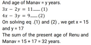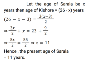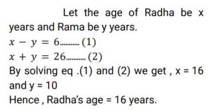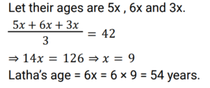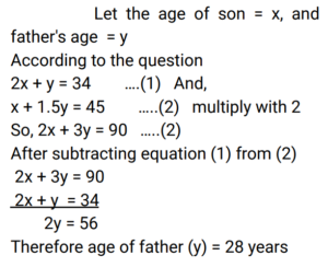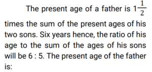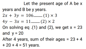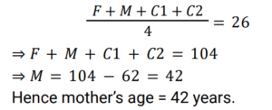 Age (Railway Maths) (Part – I)Total Questions: 5041. A is two years older than B, who is twice as old as C. If the total of their ages is 32, then what is the age of B? [Group D 29/08/2022 (Evening) ](a) 14 years(b) 12 years(c) 7 years(d) 8 yearsCorrect Answer: (b) 12 yearsSolution:42. Find the answer of given question? [Group D 30/08/2022 (Morning) ](a) 45 years(b) 36 years(c) 42 years(d) 50 yearsCorrect Answer: (c) 42 yearsSolution:43. The average age of a family of father, mother and 2 children is 26 years. If the sum of the ages of the father and the children is 62 years, find the age of the mother. [Group D 30/08/2022 (Morning)](a) 42 years(b) 30 years(c) 26 years(d) 45 yearsCorrect Answer: (a) 42 yearsSolution:44. The difference between the ages of Radha and Rama is 6 years and the sum of their ages is 26. Find Radha's age, if she is older than Rama. [Group D 30/08/2022 (Afternoon)](a) 26 years(b) 32 years(c) 16 years(d) 6 yearsCorrect Answer: (c) 16 yearsSolution:45. Geetha, Latha and Madhuri's ages are in the ratio 5 : 6 : 3. If their average age is 42 years, then find Latha's age. [Group D 30/08/2022 (Evening)](a) 54 years(b) 27 years(c) 45 years(d) 35 yearsCorrect Answer: (a) 54 yearsSolution:46. The sum of the ages of Sarala and Kishore is 26 years. If 3 years ago, Kishore was 3/2 times as old as the Sarala, then the present age of the Sarala is: [Group D 01/09/2022 (Morning) ](a) 11 years(b) 9 years(c) 10 years(d) 12 yearsCorrect Answer: (a) 11 yearsSolution:47. If twice the son's age is added to the father's age, the sum is 34 years. If 1.5 times the father's age is added to the son's age, the sum is 45 years. What is the father's age (in years)? [Group D 01/09/2022 (Afternoon)](a) 26(b) 28(c) 30(d) 32Correct Answer: (b) 28Solution:48. The sum of two times the present age of A and three times the present age of B is 106 years. Four times the present age of B exceeds three times the present age of A by 11 years. What will be the sum of the ages (in years) of A and B, 4 years from now? [Group D 01/09/2022 (Evening)](a) 49(b) 47(c) 43(d) 51Correct Answer: (d) 51Solution:49. Sanjay is 25 years older than his son and Sanjay's wife is 65 years old. If the average age of all the three members of this family is 58 years, then find the age of the son. [Group D 02/09/2022 (Afternoon)](a) 45 years(b) 43 years(c) 41 years(d) 42 yearsCorrect Answer: (d) 42 yearsSolution:50. Three times the present age of Renu is 11 years more than two times the present age of Manav, and three times the present age of Manav is 9 years less than four times the present age of Renu. The sum of the present ages (in years) of Renu and Manav is: [Group D 02/09/2022 (Afternoon) ](a) 32(b) 31(c) 37(d) 29Correct Answer: (a) 32Solution:Submit Quiz« Previous12345