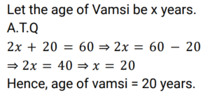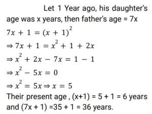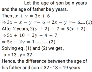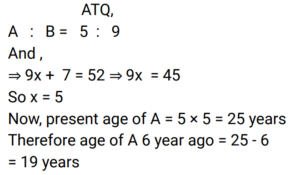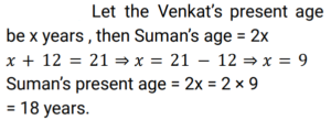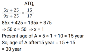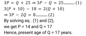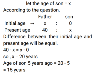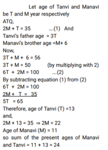 Age (Railway Maths) (Part – II)Total Questions: 501. The sum of the present ages of a father and his son is 6 years more than 3 times the present age of the son. After 2 years, 2 times the father's age will be 7 years less than 5 times the son's age. The difference (in years) between the ages of the father and the son is: [Group D 02/09/2022 (Evening)](a) 17(b) 20(c) 19(d) 23Correct Answer: (c) 19Solution:2. Suman's present age is twice that of Venkat's. Venkat's age, after 12 years, will be 21 years. Find Suman's present age. [Group D 02/09/2022 (Evening)](a) 18 years(b) 20 years(c) 16 years(d) 22 yearsCorrect Answer: (a) 18 yearsSolution:3. Vamsi's father is 60 years old. He is 20 years older than twice Vamsi's age. Find Vamsi's age. [Group D 05/09/2022 (Morning) ](a) 20 years(b) 30 years(c) 25 years(d) 15 yearsCorrect Answer: (a) 20 yearsSolution:4. A father said to his son, "I was as old as you are at the time of your birth. If the present age of the father is 40 years, then what was the age of the son 5 years ago?" [Group D 06/09/2022 (Afternoon)](a) 14 years(b) 16 years(c) 18 years(d) 15 yearsCorrect Answer: (d) 15 yearsSolution:5. Three times the present age of P is 25 years more than the present age of Q. After 10 years, twice the age of Q will be 18 years less than thrice the age of P. Find the present age (in years) of Q. [Group D 08/09/2022 (Afternoon)](a) 19(b) 21(c) 17(d) 16Correct Answer: (c) 17Solution:6. One year ago, a man was 7 times as old as his daughter. Now his age is equal to the square of his daughter's age. If daughter has already celebrated her first year birthday, then their present ages are: [Group D 08/09/2022 (Evening)](a) 7 and 49(b) 4 and 28(c) 6 and 36(d) 5 and 25Correct Answer: (c) 6 and 36Solution:7. The present ages of two persons are 46 years and 60 years, respectively. If after 'n' years, the ratio of their ages is 4 : 5, then the value of 'n' is: [Group D 09/09/2022 (Morning)](a) 11(b) 12(c) 13(d) 10Correct Answer: (d) 10Solution:8. 10 years ago, the ratio of the ages of A and B was 5 : 9. 15 years from now, the ratio of their ages will be 15 : 17. What will be A's age 15 years from now? [Group D 09/09/2022 (Afternoon)](a) 30 years(b) 38 years(c) 35 years(d) 26 yearsCorrect Answer: (a) 30 yearsSolution:9. The sum of two times Manavi's present age and Tanvi's present age is 35 years. Tanvi's father is presently three times as old as Tanvi. Manavi's brother's present age is 6 years more than Manavi's present age. The sum of the present ages of Tanvi's father and Manavi's brother is 56 years. What is the sum of the present ages (in years) of Manavi and Tanvi? [Group D 09/09/2022 (Evening)](a) 24(b) 27(c) 23(d) 31Correct Answer: (a) 24Solution:10. The ratio of the ages of A and B is 5 : 9. After 7 years, B's age will be 52 years. Six years ago, A's age was: [Group D 12/09/2022 (Afternoon)](a) 19 years(b) 35 years(c) 44 years(d) 24 yearsCorrect Answer: (a) 19 yearsSolution:Submit Quiz12345Next »