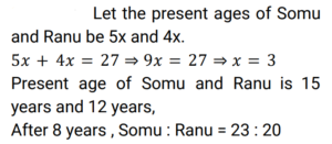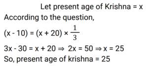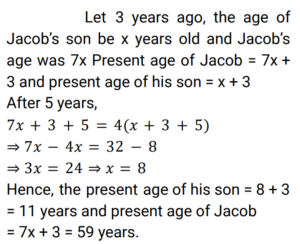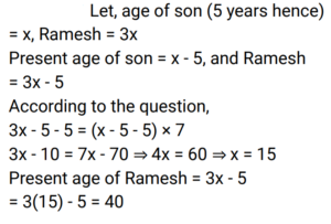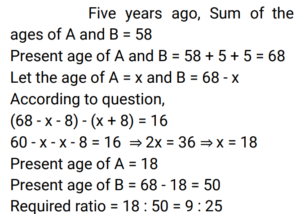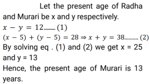 Age (Railway Maths) (Part – II)Total Questions: 5021. At present, a man is 50 years old and his daughter is 22 years old. The man will be twice as old as his daughter after ______ years. [Group D 17/09/2022 (Morning)](a) 9(b) 5(c) 18(d) 6Correct Answer: (d) 6Solution:22. Ten years ago, Krishna was one-third as old as he will be 20 years from now. Krishna's present age (in years) is ________. [Group D 17/09/2022 (Afternoon)](a) 30(b) 25(c) 45(d) 27Correct Answer: (b) 25Solution:23. The sum of the ages of William and Brijesh is 20 years. Four years ago, Brijesh's age was half of William's then age. How old (in years) is William at present? [Group D 17/09/2022 (Evening)](a) 6(b) 12(c) 10(d) 8Correct Answer: (b) 12Solution:24. Five years hence the age of Ramesh will be three times the then age of his son, and 5 years ago his age was seven times the then age of his son. Ramesh's present age (in years) is: [Group D 17/09/2022 (Evening)](a) 42(b) 40(c) 44(d) 38Correct Answer: (b) 40Solution:25. Five years hence, the age of Jacob will be four times that of his son. Three years ago, Jacob's age was seven times that of his son. Their present ages are: [Group D 18/09/2022 (Afternoon)](a) 59 and 21(b) 59 and 11(c) 69 and 11(d) 49 and 21Correct Answer: (b) 59 and 11Solution:26. The difference between the ages of Radha and Murari is 12 years. Five years ago, the sum of their ages was 28 years. If Radha is older than Murari, find Murari's present age (in years). [Group D 18/09/2022 (Afternoon) ](a) 17(b) 15(c) 13(d) 25Correct Answer: (c) 13Solution:27. The ratio of the present ages of A to B is 7 : 3. The ratio of A's age 4 years ago to B's age 4 years hence is 2 : 1. The difference between A's age 4 years hence and B's age 4 years ago is: [Group D 19/09/2022 (Evening)](a) 88 years(b) 56 years(c) 46 years(d) 36 yearsCorrect Answer: (b) 56 yearsSolution:28. Five years ago the sum of the ages of A and B was 58 years. The difference between B's age 8 years ago and A's age 8 years hence is 16 years. The ratio of the present ages of A and B is: [Group D 19/09/2022 (Evening)](a) 5 : 13(b) 9 : 25(c) 36 : 52(d) 25 : 9Correct Answer: (b) 9 : 25Solution:29. The ratio of the present ages of Monu and Sonu is 3 : 4. The ratio of the age of Monu 5 years ago and that of Sonu 5 years hence is 2 : 5. Find Monu's present age. [Group D 20/09/2022 (Morning)](a) 15 years(b) 18 years(c) 20 years(d) 66 yearsCorrect Answer: (a) 15 yearsSolution:30. The ratio of the present ages of Somu and Ranu is 5 : 4 and the sum of their ages is 27 years. The ratio of their ages after 8 years will be,_________ [Group D 20/09/2022 (Afternoon)](a) 23 : 20(b) 8 : 3(c) 25 : 29(d) 3 : 4Correct Answer: (a) 23 : 20Solution:Submit Quiz« Previous12345Next »