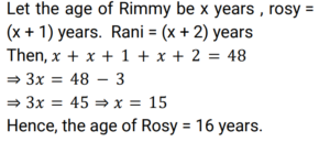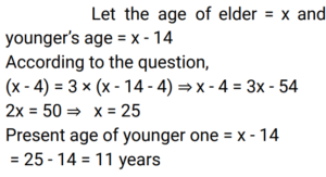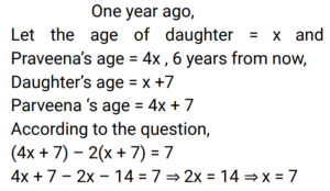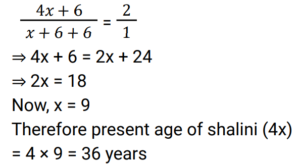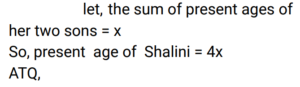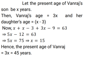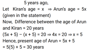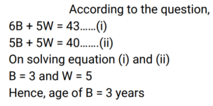 Age (Railway Maths) (Part – II)Total Questions: 5031. Five years ago, Roshan was three times as old as Preethi. If the difference between their ages is 6 years, the present age (in years) of Preethi is ________. [Group D 20/09/2022 (Afternoon)](a) 4(b) 7(c) 8(d) 6Correct Answer: (c) 8Solution:32. The age of Vanraj is thrice the age of his son. The age of his daughter is 3 years less than the age of his son. If 3 years ago the sum of the ages of these three was 63 years, then find the present age (in years) of Vanraj. [Group D 22/09/2022 (Afternoon)](a) 36(b) 30(c) 45(d) 42Correct Answer: (c) 45Solution:33. Rani is elder to Rosy by 1 year, and Rosy is elder to Rimmy by 1 year. The sum of their ages is 48 years. What is Rosy's age? [Group D 26/09/2022 (Evening)](a) 21 years(b) 16 years(c) 15 years(d) 17 yearsCorrect Answer: (b) 16 yearsSolution:34. Shalini's age is four times the sum of the ages of her two sons. Six years hence, her age will be double the sum of their ages. What is Shalini's present age? [Group D 27/09/2022 (Morning) ](a) 32 years(b) 40 years(c) 26 years(d) 36 yearsCorrect Answer: (d) 36 yearsSolution:35. Nine years ago, P's age was twice the age of Q. If the ratio of their present ages is 5 : 4, what is the sum of their present ages? [Group D 28/09/2022 (Evening)](a) 35 years(b) 27 years(c) 40 years(d) 30 yearsCorrect Answer: (b) 27 yearsSolution:36. The ages of two persons differ by 14 years. If 4 years ago, the elder one was three times as old as the younger one, then the present age of the younger one is: [Group D 29/09/2022 (Afternoon)](a) 10 years(b) 12 years(c) 11 years(d) 13 yearsCorrect Answer: (c) 11 yearsSolution:37. 16 years ago, the age of the father was 4 times the age of his son. Now the father is twice as old as his son. What is the difference between the present ages of the father and his son? [Group D 29/09/2022 (Evening)](a) 12 years(b) 16 years(c) 28 years(d) 24 yearsCorrect Answer: (d) 24 yearsSolution:38. Arun is the elder brother of Kiran. The difference in their ages is 20 years. If 5 years ago, Arun was 5 times as old as Kiran then was, then find the present age (in years) of Arun. [Group D 30/09/2022 (Morning)](a) 30(b) 40(c) 20(d) 10Correct Answer: (a) 30Solution:39. The sum of 6 times Bob's age and 5 times Will's age is 43 years, and the sum of 5 times Bob's age and 5 times Will's age is 40 years. Find the age of Bob. [Group D 30/09/2022 (Afternoon)](a) 5 years(b) 3 years(c) 1 year(d) 10 yearsCorrect Answer: (b) 3 yearsSolution:40. One year ago, Praveena was four times as old as her daughter. Six years hence, Praveena's age will exceed twice her daughter's age by 7 years. What is the sum of their present ages? [Group D 30/09/2022 (Evening)](a) 32 years(b) 37 years(c) 35 years(d) 39 yearsCorrect Answer: (b) 37 yearsSolution:Submit Quiz« Previous12345Next »