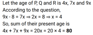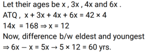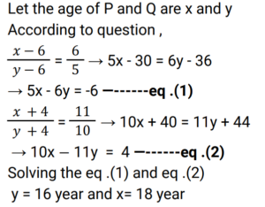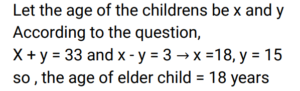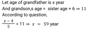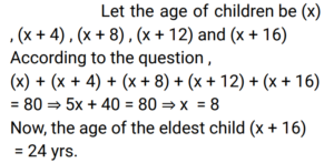 Age (Railway Maths) (Part – III)Total Questions: 5021. Ages of P, Q and R are in the ratio 4 : 7 : 9. 8 years ago, the age of R was Q's present age. What is the sum of their ages at present? [RRB JE 24/05/2019 (Evening) ](a) 60(b) 100(c) 50(d) 80Correct Answer: (d) 80Solution:22. The sum of ages of 5 children born at intervals of four years is 80. What is the age of the eldest child? [RRB JE 26/05/2019 (Morning)](a) 16(b) 18(c) 28(d) 24Correct Answer: (d) 24Solution:23. The average age of 4 persons is 42 years. If their ages are in the ratio of 1 : 3 : 4 : 6 respectively, find out the difference between the ages of the eldest and the youngest person. [RRB JE 26/05/2019 (Afternoon)](a) 60 years(b) 59 years(c) 61 years(d) 70 yearsCorrect Answer: (a) 60 yearsSolution:24. Six years ago the ratio of ages of P and Q was 6 : 5. Four years hence, it will be 11 : 10. What is the age of P now? [RRB JE 30/05/2019 (Morning)](a) 15 years(b) 18 years(c) 25 years(d) 20 yearsCorrect Answer: (b) 18 yearsSolution:25. Ages of A and B differ by 6 and are in the ratio 3 : 5. What is the sum of their ages? [RRB JE 31/05/2019 (Evening)](a) 24(b) 40(c) 16(d) 32Correct Answer: (a) 24Solution:26. If 4 years are subtracted from the age of a person and divided by 5, the result gives his grandson's age. The grandson now has a sister aged 5, six years younger to him. How old is the grandfather? [RRB JE 31/05/2019 (Evening)](a) 58(b) 57(c) 60(d) 59Correct Answer: (d) 59Solution:27. Ages of two brothers differ by 7 and are in the ratio 3 : 2. What is the sum of their ages? [RRB JE 01/06/2019 (Morning)](a) 21(b) 42(c) 35(b) 42Correct Answer: (c) 35Solution:28. Total age of two members in a family four years hence will be 64 years. Four years back their ages was in the ratio 3 : 1. What is the age of the younger of the two? [RRB JE 01/06/2019 (Afternoon)](a) 10(b) 16(c) 12(d) 15Correct Answer: (b) 16Solution:29. Sum and difference of the ages of two children are 33 and 3 respectively. What is the age of the elder child? [RRB JE 01/06/2019 (Afternoon)](a) 15 years(b) 16 years(c) 18 years(d) 24 yearsCorrect Answer: (c) 18 yearsSolution:30. Five years ago, the average age of a couple was 24. At present, the average of the couple and a child is 20. What is the child's age? [RRB JE 01/06/2019 (Evening)](a) 1 year(b) 2 years(c) 4 years(d) 3 yearsCorrect Answer: (b) 2 yearsSolution:Submit Quiz« Previous12345Next »