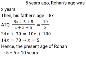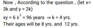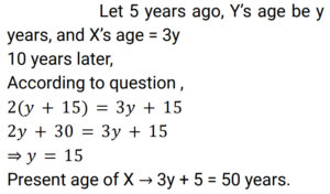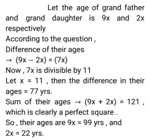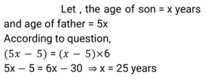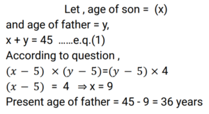 Age (Railway Maths) (Part – III)Total Questions: 5031. A father has a 12 year old son. He was thrice his son's present age when the son was born. How old is the father now? [RRB JE 02/06/2019 (Afternoon)](a) 48 years(b) 46 years(c) 60 years(d) 40 yearsCorrect Answer: (a) 48 yearsSolution:32. A grandfather and his granddaughter have their ages in the ratio 9 : 2. Sum of their ages is a perfect square. The difference in their ages is a multiple of 11. What are their ages? [RRB JE 02/06/2019 (Afternoon)](a) 90, 20(b) 95, 25(c) 72, 16(d) 99, 22Correct Answer: (d) 99, 22Solution:33. The sum and difference of the ages of two brothers are in the ratio 5 : 1. If the product of their ages is 96, then what are their ages? [RRB JE 26/06/2019 (Evening)](a) 8, 12(b) 6, 16(c) 6, 10(c) 6, 10Correct Answer: (a) 8, 12Solution:34. Sum of the ages of two sisters is 81. Their ages are in the ratio 4 : 5. By how many years is one sister younger than the other? [RRB JE 27/06/2019 (Morning)](a) 9(b) 27(c) 18(d) 12Correct Answer: (a) 9Solution:35. The sum of the ages of a father and son is 45 years. Five years ago, the product of their ages was four times the father's age at that time. What is the present age of the father? [RRB JE 27/06/2019 (Evening)](a) 36(b) 42(c) 28(d) 60Correct Answer: (a) 36Solution:36. A father is now five times as old as his son. Five years back, he was six times as old as his son. Find the age of his son. [RRB JE 27/06/2019 (Evening)](a) 32 years(b) 35 years(c) 25 years(d) 28 yearsCorrect Answer: (c) 25 yearsSolution:37. A is two years older than B who is twice as old as C. If the total ages of A, B and C are 27, then how old is B? [RRB JE 28/06/2019 (Evening)](a) 9(b) 7(c) 10(d) 8Correct Answer: (c) 10Solution:38. The total age of A and B is 12 years more than the total age of B and C. Who is younger among A and C, and by how many years ? [RRB JE 28/06/2019 (Evening) ](a) A, by 6 years(b) C, by 12 years(c) A, by 12 years(d) C, by 6 yearsCorrect Answer: (b) C, by 12 yearsSolution:39. Five years ago X was three times as old as Y and ten years hence, X will be twice as old as Y. What is the present age of X? [ALP Tier II 21/01/2019 (Afternoon) ](a) 50(b) 60(c) 30(d) 40Correct Answer: (a) 50Solution:40. 5 years ago, Rohan's father's age was 8 times Rohan's age. After 5 years the ratio of Rohan's father's age to Rohan's age will be 10 : 3. What is the present age of Rohan? [ALP Tier II 21/01/2019 (Afternoon) ](a) 10 years(b) 8 years(c) 15 years(d) 12 yearsCorrect Answer: (a) 10 yearsSolution:Submit Quiz« Previous12345Next »