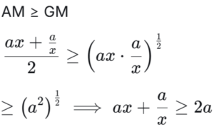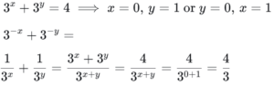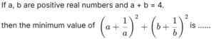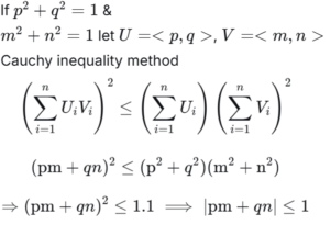 Algebra (Mathematics Chapterwise Solved Papers for Teaching) (Part-2)Theory of Equation and InequationsTotal Questions: 5011. If one root of any equation is (2 – 3i) (where i = √-1), then what is the equation? [DSSSB PGT 2021](a) 𝓍²- 4𝓍+12=0(b) 𝓍²- 4𝓍 + 13 = 0(c) 𝓍²+4𝓍-13= 0(d) 𝓍² + 4𝓍 +12 = 0Correct Answer: (b) 𝓍²- 4𝓍 + 13 = 0Solution:If one root is (2-31) then, other root will be (2+3i) Equation: 𝓍² -(4)𝓍 + (4-9i²) = 0 ⇒ 𝓍²-4𝓍+(4+9) = 0 ⇒ 𝓍²-4𝓍+13 = 012. Solve the following equation. [DSSSB PGT 2021](a) 1/2(b) 1(c) 0(d) -1Correct Answer: (c) 0Solution:13. Arrange the values in ascending order 2⁶³, 3⁴⁵, 5²⁷, 6¹⁸ [DSSSB PGT 2021](a) 2⁶³, 5²⁷, 6¹⁸, 3⁴⁵(b) 5²⁷, 6¹⁸, 2⁶³, 3⁴⁵(c) 3⁴⁵, 5²⁷, 2⁶³, 6¹⁸(d) 6¹⁸, 5²⁷,2⁶³, 3⁴⁵Correct Answer: (d) 6¹⁸, 5²⁷,2⁶³, 3⁴⁵Solution:14. If 3ˣ +3ʸ = 4, then the value of 3⁻ˣ + 3⁻ʸ is - [DSSSB PGT 2021](a) 1/2(b) 4/3(c) 1(d) 3/4Correct Answer: (b) 4/3Solution:15. Solve the following equation: [DSSSB PGT 2021 ](a) -(1/2)(b) 1/2(c) 0(d) 1Correct Answer: (c) 0Solution:16. If the mulitiplication of two roots is -3, then what is the value of 'b' from this equation 2𝓍²- 7𝓍+b=0 [DSSSB PGT 2021](a) -(3/2)(b) +(3/2)(c) -6(d) +6Correct Answer: (c) -6Solution:2𝓍²- 7𝓍+b=0 Product of root = -3 = (b/2) → b = -617. Solve the following equation? [DSSSB PGT 2021](a) 5/3(b) 25/3(c) 25/2(d) 15/5Correct Answer: (c) 25/2Solution:18. If p²+q² = 1 and m²+n² = 1 then- [DSSSB PGT 2021](a) |pq+mn| >1(b) |pq-mn| <1(c) |pm+qn| ≥1(d) |pm+qn| ≤1Correct Answer: (d) |pm+qn| ≤1Solution:19. If a, b, care positive real numbers and 2a+3b+6c = 3, then the minimum value of a²+b²+c² is : [DSSSB PGT 2021](a) 7/49(b) 9/49(c) 8/49(d) 6/49Correct Answer: (b) 9/49Solution:20. For any two positive numbers a and 𝓍, least value of a𝓍 + (a/𝓍) is : [DSSSB PGT 2021](a) a(b) 2a(c) √2a²(d) a²Correct Answer: (b) 2aSolution:Submit Quiz« Previous12345Next »