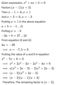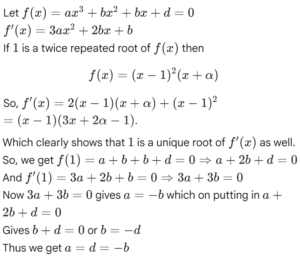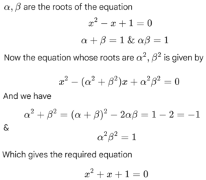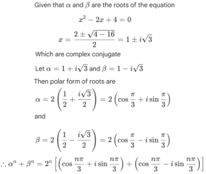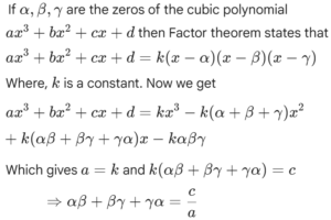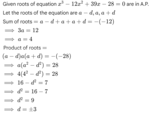 Algebra (Mathematics Chapterwise Solved Papers for Teaching) (Part-4)Theory of Equation and InequationsTotal Questions: 5041. If the equation 9√𝓍-7√𝓍-36 = -16, then the value of '𝓍' is: [Haryana TGT 2019](a) 5(b) 10(c) 20(d) 100Correct Answer: (d) 100Solution:42. If α, β,λ are zeros of the cubic polynomial a𝓍³ +b𝓍² +c𝓍 +d, then αβ+βγ+αγ is equal to: [Haryana TGT 2019](a) -(b/a)(b) b/a(c) c/a(d) d/aCorrect Answer: (c) c/aSolution:43. The zeros of the quadratic polynomial 𝓍² +99𝓍 +127 are: [Haryana TGT 2019](a) Both positive(b) Both negative(c) Both equal(d) One positive and one negativeCorrect Answer: (b) Both negativeSolution:Let α and β be the zeros of the quadratic polynomial 𝓍² + 99𝓍 + 127 Then we have Sum of zeros = α + β = -99 & Product of zeros = αβ = 127 Which clearly shows that both the zeros, α and β, must be negative.44. If the roots of the equation 3𝓍² + 2𝓍 + p(p - 1) = 0 are of opposite signs, then: [Haryana PGT 2020](a) p ∈ (-∞, 0)(b) p ∈ (0,1)(c) p ∈ (1, ∞)(d) p ∈ (4, ∞)Correct Answer: (b) p ∈ (0,1)Solution:Given equation 3𝓍² + 2𝓍 + p(p - 1) = 0 If the roots of the given equation are of opposite sign then product of roots is negative i.e. 45. If 1 is a twice repeated root of the equation a𝓍³ +b𝓍² +b𝓍+d = 0, then: [Haryana PGT 2018](a) a = d = b(b) a = d = -b(c) a= -d = b(d) -a = d = -bCorrect Answer: (b) a = d = -bSolution:46. If α, β are the roots of the equation 𝓍²-𝓍+1 = 0, the equation whose roots are α², β² is : [UKPSC GIC 2018](a) 𝓍²+𝓍-1=0(b) x²+𝓍+1= 0(c) 𝓍²-𝓍- 1 = 0(d) 𝓍⁴-𝓍²-1=0Correct Answer: (b) x²+𝓍+1= 0Solution:47. If α and β are the roots of the equation 𝓍²- 2𝓍 +4=0, then value of αⁿ+βⁿ is [(GIC) EXAM, 2015](a)(b)(c)(d)Correct Answer: (a)Solution:48. The roots of the equation 𝓍³- 12𝓍²+ 39𝓍 – 28-0 are in A.P., the common difference is [UP TGT-2016 (08-03-2019)](a) 2(b) 3(c) -2(d) 4Correct Answer: (b) 3Solution:49. If 𝓍–1 and 𝓍+3 are the two factors of 𝓍³+ a𝓍 +b, then remaining factor is [UP TGT-2016 (08-03-2019)](a) 𝓍+2(b) 𝓍-2(c) 𝓍-3(d) 𝓍+1Correct Answer: (b) 𝓍-2Solution:50. The equations 2𝓍-ky+7 =0 and 6𝓍-12y+15 = have no solution for [UP TGT-2016 (08-03-2019)](a) k= -4(b) k =4(c) k=1(d) k= -1Correct Answer: (b) k =4Solution:Submit Quiz« Previous12345