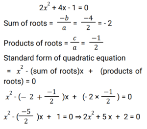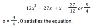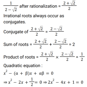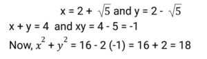 Algebra (Railway Maths) (Part – II)Total Questions: 5011. Solve: (a − b)³ + (b − 2c)³ + (−a + 2c)³. [Group D 25/08/2022 (Evening)](a) a − b + 2c(b) a − 2c + 4b(c) 3((a − b)(b − 2c)(−a + 2c))(d) (a − b + 2c)²Correct Answer: (c) 3((a − b)(b − 2c)(−a + 2c))Solution:12. The roots of quadratic equation that satisfies 12x² = 27x are: [Group D 25/08/2022 (Evening) ](a) 0, 3/4(b) 1, 4/3(c) 1, 3/4(d) 0, 9/4Correct Answer: (d) 0, 9/4Solution:13. Simplify (2z − 5y)² + (5z + 2y)² − 25z² [Group D 26/08/2022 (Morning)](a) 19y² + 4z²(b) 29y² + 4z²(c) 19y² − 4z²(d) 29y² − 4z²Correct Answer: (b) 29y² + 4z²Solution:After simplification, 4z² + 25y² - 20yz + 25z² + 4y² +20yz - 25z² = 29y² + 4z²14. The equation 2x² + 7x + 6 = 0 can be written as: [Group D 26/08/2022 (Morning)](a) (2x − 3)(x + 2) = 0(b) (2x + 3)(x + 2) = 0(c) (2x + 3)(x − 2) = 0(d) (2x − 3)(x − 2) = 0Correct Answer: (b) (2x + 3)(x + 2) = 0Solution:2x² + 7x +6 = 0 ⇒ 2x² + 4x + 3x + 6 = 0 ⇒ 2x(x + 2) + 3(x + 2) = 0 So, (2x + 3)(x + 2) = 015. If a² + b² = 50 and a × b = 7, find (a - b) / (a + b), where a>b. [Group D 26/08/2022 (Morning)](a) 3/5(b) 4/3(c) 5/3(d) 3/4Correct Answer: (d) 3/4Solution:16. If one of the roots of a quadratic equation is 1/ 2 - √2 , then find the quadratic equation. [Group D 26/08/2022 (Morning)](a) √2x² + 3x + 2 = 0(b) −2x² + 3x + 5 = 0(c) √2x² + 3x − 2 = 0(d) 2x² − 4x + 1 = 0Correct Answer: (d) 2x² − 4x + 1 = 0Solution:17. x² − 2x + 3 = 0 is a ______. [Group D 26/08/2022 (Afternoon)](a) cubic equation(b) quadratic equation(c) quadratic polynomial(d) cubic polynomialCorrect Answer: (b) quadratic equationSolution:A quadratic equation is a second order equation written as ax² + bx + c = 0 ,where a, b, and c are coefficients of real numbers and a ≠ 0. We can clearly see that x² -2x +3 =0 is a quadratic equation.18. Find the quadratic equation whose roots are equal to the sum and product of the roots of the quadratic equation 2x² + 4x − 1 = 0. [Group D 26/08/2022 (Afternoon)](a) −x² + 5x + 1 = 0(b) x² + 2x + 5 = 0(c) 2x² − x + 5 = 0(d) 2x² + 5x + 2 = 0Correct Answer: (d) 2x² + 5x + 2 = 0Solution:19. If x³ − 3x + 6 = 0 then it is ______. [Group D 26/08/2022 (Evening)](a) a quadratic equation(b) a quadratic expression(c) not a quadratic equation(d) a linear equationCorrect Answer: (c) not a quadratic equationSolution:x³ - 3x + 6 = 0 A quadratic equation is a second order equation written as ax ² + bx + c = 0 where a, b, and c are coefficients of real numbers and a ≠ 0. we can clearly see that x³ - 3x + 6 = 0 is not a quadratic equation.20. If x = 2 + √5 and y = 2 − √5, then find the value of x² + y². [Group D 26/08/2022 (Evening)](a) 18(b) 20(c) 16(d) 22Correct Answer: (a) 18Solution:Submit Quiz« Previous12345Next »