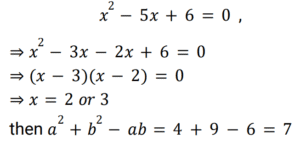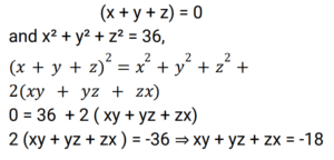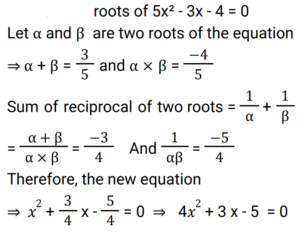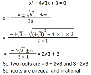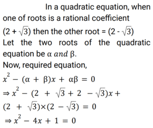 Algebra (Railway Maths) (Part – IV)Total Questions: 5031. Which of the options given below correctly describes the nature of the roots of the quadratic equation x² + 4√3x + 3 = 0? [Group D 19/09/2022 (Evening) ](a) irrational and equal(b) irrational and unequal(c) rational and equal(d) rational and unequalCorrect Answer: (b) irrational and unequalSolution:32. The roots of 2²ˣ - 10 × 2ˣ + 16 = 0 are : [Group D 19/09/2022 (Evening) ](a) 2 , 3(b) 1 , 8(c) 2 , 8(d) 1 , 3Correct Answer: (d) 1 , 3Solution:33. The positive root of 4x² − 1 = 0 is: [Group D 20/09/2022 (Morning)](a) 1/2(b) 1/4(c) 1(d) 2Correct Answer: (a) 1/2Solution:34. If one of the roots of a quadratic equation with rational coefficients is 2 + √3, then the quadratic equation is given as [Group D 20/09/2022 (Morning)](a) x² = 2 − √3(b) x² − 4x + 1 = 0(c) x² + 4x − 1 = 0(d) x² − 2 = 0Correct Answer: (b) x² − 4x + 1 = 0Solution:35. If (x + y + z) = 0 and x² + y² + z² = 36, then the value of xy + yz + zx is: [Group D 20/09/2022 (Morning)](a) −18(b) −6(c) 18(d) −28Correct Answer: (a) −18Solution:36. The value of [Group D 20/09/2022 (Morning) ](a) x - y(b) 1/x + 1/y(c) 1/x - 1/y(d) x + yCorrect Answer: (d) x + ySolution:37. If the two roots of a quadratic equation are −3 and 3, then the quadratic equation is given as ________. [Group D 20/09/2022 (Afternoon)](a) x² + 5 = 0(b) 9x² − 1 = 0(c) x² − 9 = 0(d) x² − 6 = 0Correct Answer: (c) x² − 9 = 0Solution:38. If a, b are the roots of the equation x² − 5x + 6 = 0, then a² + b² − ab is: [Group D 20/09/2022 (Evening)](a) −7(b) 9(c) 7(d) 43Correct Answer: (c) 7Solution:39. The product of the roots of 6√3x² + 5x + 3√3 = 0 is [Group D 20/09/2022 (Evening)](a) 1/2(b) 1(c) √3(d) 0Correct Answer: (a) 1/2Solution:40. An equation, whose roots are the reciprocals of the roots of the equation 5x² − 3x − 4 = 0, is: [Group D 22/09/2022 (Morning)](a) 4x² − 3x − 5 = 0(b) 4x² + 3x − 5 = 0(c) 4x² − 3x + 5 = 0(d) 4x² − 3x + 5 = 0Correct Answer: (b) 4x² + 3x − 5 = 0Solution:Submit Quiz« Previous12345Next »