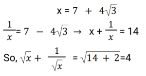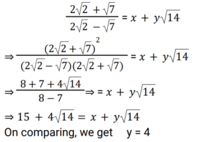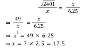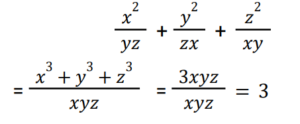 Algebra (Railway Maths) (Part – VII)Total Questions: 5021. Find the value of x in the given equation. √2401 / x = x / 6.25 [RRB NTPC 29/01/2021 (Evening)](a) 15.5(b) 17.5(c) 27.5(d) 7.5Correct Answer: (b) 17.5Solution:22. If a + b + c = 0, then find the value of (a² + b² + c²)² / (a²b² + b²c² + c²a²) [RRB NTPC 30/01/2021 (Morning)](a) 2(b) 0(c) 1(d) 4Correct Answer: (d) 4Solution:23. If (2√2 + √7) / (2√2 − √7) = x + y√14, find the value of y. [RRB NTPC 30/01/2021 (Morning)](a) 4(b) 0(c) 19(d) 15Correct Answer: (a) 4Solution:24. If a¹/³ = 6, then find the value of a² − 36a. [RRB NTPC 30/01/2021 (Evening)](a) 7776(b) 38880(c) −180(d) 0Correct Answer: (b) 38880Solution:25. If x = 7 + 4√3 then find value of √x + 1/√x(a) 4√2(b) 6(c) 1 + √2(d) 4Correct Answer: (d) 4Solution:26. Find the answer of given question? [RRB NTPC 02/02/2021 (Morning) ](a) 8/25 or 17/25(b) 9/25 or 16/25(c) 19/25 or 6/25(d) 12/25 or 13/25Correct Answer: (b) 9/25 or 16/25Solution:27. If x + y + z = 0, then what will be the value of x²/yz + y²/zx + z²/xy ? [RRB NTPC 02/02/2021 (Morning) ](a) x²y²z² / x(b) 3(c) 3x² + 3y² + 3z² / x(d) x² + y² + z²Correct Answer: (b) 3Solution:28. Solve the following: [RRB NTPC 02/02/2021 (Morning)](a) 1 + 1/(x + 4)(b) x + 4(c) 1/x(d) (x + 4)/xCorrect Answer: (d) (x + 4)/xSolution:29. If the sum of three numbers is zero, then which of the options below will always be equal to the value of the sum of the cubes of those numbers? [RRB NTPC 02/02/2021 (Evening)](a) One(b) Three times the product of the three numbers(c) Product of the three numbers(d) ZeroCorrect Answer: (b) Three times the product of the three numbersSolution:If a + b + c = 0 Then a³ + b³ + c³ = 3abc30. The pair of equations 2ˣ ⁺ ʸ = 16 and 64ˣ ⁻ ʸ = 2 has: [RRB NTPC 03/02/2021 (Morning)](a) Unique solution x = 23/12, y = 25/12(b) Infinite solutions(c) No common solution(d) Unique solution x = 25/12, y = 23/12Correct Answer: (d) Unique solution x = 25/12, y = 23/12Solution:Submit Quiz« Previous12345Next »