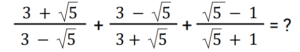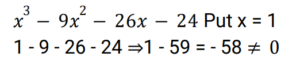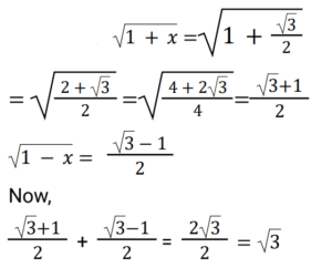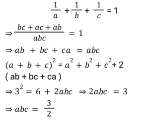 Algebra (Railway Maths) (Part – VIII)Total Questions: 5011. Solve the given equation. [RRB NTPC 16/02/2021 (Evening) ](a)(b)(c)(d)Correct Answer: (a)Solution:12. If a² + b² + c² + 3 = 2(a + b + c), then the value of (a + b + c) is: [RRB NTPC 17/02/2021 (Morning)](a) 2(b) 3(c) 5(d) 4Correct Answer: (b) 3Solution:13. If x³ − 9x² − 26x − 24 = 0, then which of the values of x given in the options will provide an INCORRECT solution to the given equation? [RRB NTPC 17/02/2021 (Evening)](a) 3(b) 4(c) 2(d) 1Correct Answer: (d) 1Solution:14. If x² − 3x + 1 = 0, then the value of x² + x + (1/x) + (1/x²) is: [RRB NTPC 22/02/2021 (Evening)](a) 2(b) 10(c) 6(d) 8Correct Answer: (b) 10Solution:15. If x = (√5 + 1) / (√5 − 1) and y = 1/x, then what will be the value of x² + y²? [RRB NTPC 22/02/2021 (Evening)](a) 4(b) 6(c) 7(d) 5Correct Answer: (c) 7Solution:16. If a = 0.1 + √0.9 and b = 0.1 − √0.9, then what will be the value of a² + b²? [RRB NTPC 22/02/2021 (Evening)](a) 2.82(b) 1.82(c) 1.9(d) 2Correct Answer: (b) 1.82Solution:17. If x = √3 / 2, then find the value of √(1 + x) + √(1 − x). [RRB NTPC 27/02/2021 (Morning)](a) 2 + √3(b) 2 − √3(c) √3 / 2(d) √3Correct Answer: (d) √3Solution:18. If a + b + c = 3, a² + b² + c² = 6 and 1/a + 1/b + 1/c = 1, where a, b and c ≠ 0, then abc = ? [RRB NTPC 27/02/2021 (Morning)](a) 1(b) 5/2(c) 1/2(d) 3/2Correct Answer: (d) 3/2Solution:19. If a = 2b = 3c and a + b + c = 121, then √(a² + b² + c²) is: [RRB NTPC 27/02/2021 (Evening)](a) 75(b) 77(c) 73(d) 72Correct Answer: (b) 77Solution:20. If x + y + z = 0, then the value of x²/yz + y²/zx + z²/xy is: [RRB NTPC 27/02/2021 (Evening)](a) 2(b) 4(c) 3(d) 1Correct Answer: (c) 3Solution:Submit Quiz« Previous12345Next »