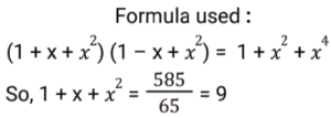 Algebra (SSC) (Part-10)Total Questions: 501. Solve the following equation: [SSC CHSL 26/05/2022 (Morning)](a) 18(b) 15(c) 16(d) 17Correct Answer: (a) 18Solution:2. Solve the following equation: [SSC CHSL 26/05/2022 (Afternoon)](a) 10(b) 1(c) 18(d) 16Correct Answer: (c) 18Solution:3. Solve the following equation: [SSC CHSL 26/05/2022 (Afternoon)] (a)(b)(c)(d)Correct Answer: (b)Solution:4. Solve the equation: [SSC CHSL 26/05/2022 (Evening)] (a)(b)(c)(d)Correct Answer: (a)Solution:5. If 1 + 𝓍² + 𝓍⁴ = 585 and 1 - 𝓍 + 𝓍² = 65, then find the value of 1 + 𝓍 + 𝓍² . [SSC CHSL 26/05/2022 (Evening)](a) 8(b) 7(c) 6(d) 9Correct Answer: (d) 9Solution:6. If a = 2022, b = 2021 and c = 2020, then value of a² + b² + c² – ab – bc - ca is: [SSC CHSL 26/05/2022 (Evening)](a) 2(b) 4(c) 3(d) 1Correct Answer: (c) 3Solution:7. If 𝓍² + 4y² = 40, 𝓍y = 6, and x > 2y, then the value of x - 2y is: [SSC CHSL 27/05/2022 (Morning)](a) 1(b) 3(c) 2(d) 4Correct Answer: (d) 4Solution:8. If 𝓍² - 8𝓍 + 1 = 0, what is the value of 𝓍⁸ - 3842𝓍⁴ + 1 ? [SSC CHSL 27/05/2022 (Morning)](a) − 1(b) 0(c) 2(d) 1Correct Answer: (b) 0Solution:9. 144𝓍² - 36𝓍 + 9/4 can be expressed as the square of _______ . [SSC CHSL 27/05/2022 (Evening)](a)(b)(c)(d)Correct Answer: (c)Solution:10. The sum of two numbers is 17 and their product is 34. Find the sum of their squares. [SSC CHSL 30/05/2022 (Morning)](a) 224(b) 221(c) 225(d) 222Correct Answer: (b) 221Solution:Submit Quiz12345Next »