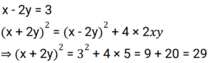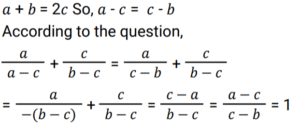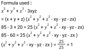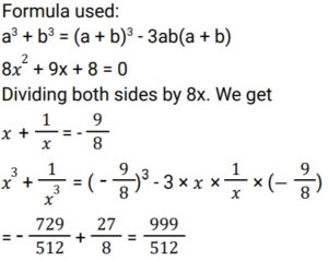 Algebra (SSC) (Part-10)Total Questions: 5021. Simplify : 3๐๐ ร (๐ + ๐)โปยน ร (๐โปยน + ๐โปยน) [SSC CHSL 31/05/2022 (Evening)](d) 3(a) 1/(๐ + ๐)(b) 1(c) (a + b)Correct Answer: (d) 3Solution:22. Solve the following equation: [SSC CHSL 31/05/2022 (Evening)](a) 69(d) 11(b) 121(c) 81Correct Answer: (d) 11Solution:23. If 8๐ยฒ + 9๐ + 8 = 0, then the value of ๐ยณ + (1/๐ยณ) is: [SSC CHSL 01/06/2022 (Morning)](a) 999/212(b) 199/212(c) 999/512(d) 199/512Correct Answer: (c) 999/512Solution:24. Expand ๐ฅยฒ + 2๐ฅ + 3 about ๐ฅ = -2 [SSC CHSL 01/06/2022 (Afternoon)](a) (๐ฅ - 2)ยฒ โ 2(๐ฅ + 2) + 3(b) (๐ฅ + 2)ยฒ โ 2(๐ฅ + 2) + 3(c) (๐ฅ + 2)ยฒ + 2(๐ฅ + 2) + 3(d) (๐ฅ - 2)ยฒ โ 2(๐ฅ - 2) - 3Correct Answer: (b) (๐ฅ + 2)ยฒ โ 2(๐ฅ + 2) + 3Solution:25. If a + b = 2c then the value of : [SSC CHSL 01/06/2022 (Afternoon)](a) 1/2(b) 1(c) 0(d) -1Correct Answer: (b) 1Solution:26. If ๐ฅ + ๐ฆ + ๐ง = 25 , ๐ฅยณ + ๐ฆยณ + ๐งยณ = 85 and ๐ฅ๐ฆ๐ง = 20, then find the value of ๐ฅยฒ + ๐ฆยฒ + ๐งยฒ โ ๐ฅ๐ฆ โ ๐ฆ๐ง โ ๐ง๐ฅ. [SSC CHSL 01/06/2022 (Evening)](a) 2(b) 1(c) 4(d) 3Correct Answer: (b) 1Solution:27. Which among the below options can be a square root of ? [SSC CHSL 02/06/2022 (Afternoon)](xยฒ - 14x + 49) (xยฒ + 6x + 9)(a) (x - 4)(x + 9)(b) (x - 1)(x + 17)(c) (x - 7)(x + 3)(d) (x - 3)(x + 8)Correct Answer: (c) (x - 7)(x + 3)Solution:28. Solve the following equation: [SSC CHSL 02/06/2022 (Afternoon)](a) 2/3(b) xยฒ + y(c) 1(d) x + yยฒCorrect Answer: (a) 2/3Solution:29. The factors of ๐ยฒ - 1 - 2x - ๐ฅยฒ are _______. [SSC CHSL 02/06/2022 (Evening)](a) (a - x - 1)(a - x - 1)(b) (a + 1 + x)(a - 1 - x)(c) (a - x + 1)(a - x + 1(d) (a - x + 1)(a - x - 1)Correct Answer: (b) (a + 1 + x)(a - 1 - x)Solution:30. If ๐ฅ - 2y = 3 and 2๐ฅy = 5, then find the value of (๐ฅ + 2y)ยฒ [SSC CHSL 03/06/2022 (Morning)](a) 29(b) 27(c) 30(d) 28Correct Answer: (a) 29Solution:Submit Quiz« Previous12345Next »