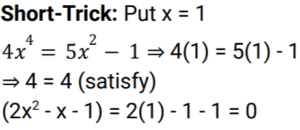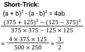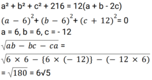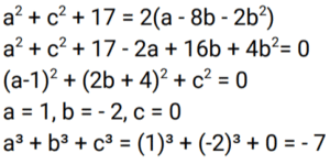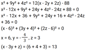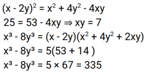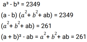 Algebra (SSC) (Part-11)Total Questions: 5041. If x² + 4y² = 53 and x - 2y = 5, then what is the value of x³ - 8y³ ? [SSC CGL 16/08/2021 (Evening)](a) - 85(b) 335(c) 155(d) 85Correct Answer: (b) 335Solution:42. If a² + c² + 17 = 2(a - 8b - 2b²), then what is the value of (a³ + b³ + c³)? [SSC CGL 17/08/2021 (Morning)](a) 9(b) - 7(c) 10(d) - 4Correct Answer: (b) - 7Solution:43. Solve the following equation: [SSC CGL 17/08/2021 (Evening)](a) 0(b) 1(c) - 2(d) 2Correct Answer: (a) 0Solution:44. If x² + 9y² + 4z² = 12(x - 2y + 2z) - 88, then the value of (x - 3y + z) is: [SSC CGL 17/08/2021 (Evening)](a) 10(b) 13(c) 11(d) 5Correct Answer: (b) 13Solution:45. Simplify the following expression. [SSC CGL 18/08/2021 (Morning)](a) 15/8(b) 3/4(c) 3/2(d) 27/28Correct Answer: (c) 3/2Solution:46. Simplify the following expression. [SSC CGL 18/08/2021 (Afternoon)] (a)(b)(c)(d)Correct Answer: (b)Solution:47. Simplify the following expression. [SSC CGL 18/08/2021 (Afternoon)](a) 5(b) -15(c) 15(d) 75Correct Answer: (c) 15Solution:48. If a³ - b³ = 2349 and (a - b) = 9, then (a + b)² - ab is equal to: [SSC CGL 18/08/2021 (Evening)](a) 261(b) 280(c) 229(d) 244Correct Answer: (a) 261Solution:49. If a + b + c = 0, then what is the value of: [SSC CGL 18/08/2021 (Evening)](a) 1(b) - 3(c) -1(d) 3Correct Answer: (d) 3Solution:50. If a² + b² + c² + 216 = 12(a + b - 2c), then √(ab - bc - ca) is: [SSC CGL 20/08/2021 (Morning)](a) 6√5(b) 4√5(c) 3√5(d) 8√5Correct Answer: (a) 6√5Solution:Submit Quiz« Previous12345