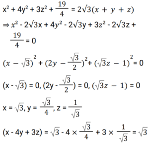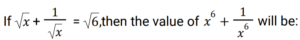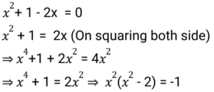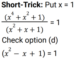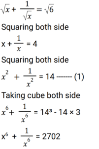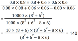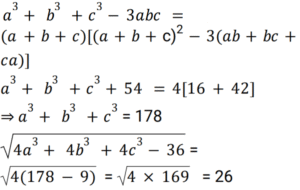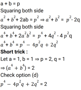 Algebra (SSC) (Part-12)Total Questions: 5121. Solve the following equation: [SSC CHSL 16/04/2021 (Morning)](a) 12(b) 22(c) 14(d) 10Correct Answer: (d) 10Solution:22. If 𝑎² + 4𝑏² + 25𝑐² + 18 = 2(𝑎 - 2𝑏 +20𝑐), then what is the value of (a + 2b + 5c) ? [SSC CHSL 16/04/2021 (Afternoon)](a) 3(b) 4(c) 6(d) 5Correct Answer: (b) 4Solution:23. Simplify the following expression. [SSC CHSL 16/04/2021 (Evening)](a) 14(b) 1.4(c) 140(d) 160Correct Answer: (c) 140Solution:24. If 𝑥² + 𝑦² = 45 and x - y = 5 then what is the value of 𝑥³ + 𝑦³ ? [SSC CHSL 16/04/2021 (Evening)](a) 150(b) 250(c) - 25(d) 275Correct Answer: (d) 275Solution:25. If a + b + c = 4, ab + bc + ca = - 14 and abc = - 18, then the value of √(4a³ + 4b³ + 4c³ - 36) will be: [SSC CHSL 19/04/2021 (Evening)](a) 26(b) 24(c) 25(d) 18Correct Answer: (a) 26Solution:26. Using algebraic identities, simplify the following expression. [SSC CHSL 04/08/2021 (Morning)](a) (𝑥² - 2𝑥 + 1)(b) (𝑥² + 𝑥 + 1)(c) (𝑥² + 2𝑥 + 1)(d) (𝑥² - 𝑥 + 1)Correct Answer: (d) (𝑥² - 𝑥 + 1)Solution:27. If a + b = p, ab = q the (a⁴ + b⁴) is equal to : [SSC CHSL 04/08/2021 (Morning)](a) 𝑝⁴ - 2𝑝²𝑞² + 2𝑞²(b) 𝑝⁴ - 4𝑝²𝑞² + 2𝑞²(c) 𝑝⁴ - 4𝑝²𝑞 + 𝑞²(d) 𝑝⁴ - 4𝑝²𝑞 + 2𝑞²Correct Answer: (d) 𝑝⁴ - 4𝑝²𝑞 + 2𝑞²Solution:28. Solve the following equation: [SSC CHSL 04/08/2021 (Afternoon)](a) 2270(b) 2502(c) 2702(d) 2712Correct Answer: (c) 2702Solution:29. If x² + 1 - 2x = 0, x > 0, then x²(x² - 2) = _____. [SSC CHSL 04/08/2021 (Evening)](a) 1(b) √2(c) -1(d) 0Correct Answer: (c) -1Solution:30. Solve the following equation: [SSC CHSL 05/08/2021 (Morning)](a) √3/2(b) 2√3(c) √3(d) √3/3Correct Answer: (c) √3Solution:Submit Quiz« Previous123456Next »