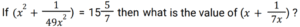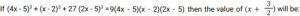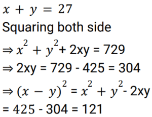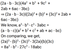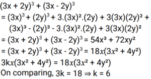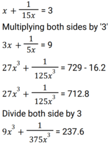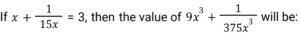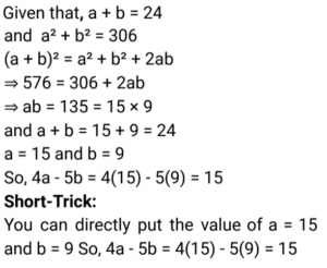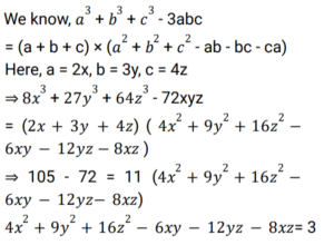 Algebra (SSC) (Part-12)Total Questions: 5131. If 9๐ฅยฒ โ 6๐ฅ + 1 = 0, then the value of 27๐ฅยณ + (27๐ฅยณ)โปยน will be: [SSC CHSL 05/08/2021 (Afternoon)](a) 8(c) 2(b) 4(d) 1Correct Answer: (c) 2Solution:32. Solve the following equation: [SSC CHSL 05/08/2021 (Afternoon)](a) 3/2(b) 1/2(c) 7/2(d) 5/2Correct Answer: (c) 7/2Solution:33. If a + b = 24 and aยฒ + bยฒ = 306, where a > b, then the value of 4a - 5b is: [SSC CHSL 05/08/2021 (Evening)](a) 18(b) 20(c) 12(d) 15Correct Answer: (d) 15Solution:34. If a + b - c = 0, then what is the value of: [SSC CHSL 06/08/2021 (Morning)](a) 1/2(b) -3/4(c) -1/2(d) 3/4Correct Answer: (b) -3/4Solution:35. Simplify the following expression: [SSC CHSL 06/08/2021 (Morning)](2๐ - ๐ - 3๐)(4๐ยฒ + ๐ยฒ + 9๐ยฒ + 2๐๐ + 6๐๐ - 3๐๐)(a) โ 8๐ยณ + ๐ยณ + 27๐ยณ(b) 8๐ยณ + ๐ยณ + 27๐ยณ(c) 8๐ยณ โ ๐ยณ โ 27๐ยณ โ 18๐๐๐(d) 8๐ยณ - ๐ยณ - 27๐ยณ + 18๐๐๐Correct Answer: (c) 8๐ยณ โ ๐ยณ โ 27๐ยณ โ 18๐๐๐Solution:36. Solve the following equation: [SSC CHSL 06/08/2021 (Afternoon)](a) 7(b) ยฑ7(c) ยฑ4(d) 4Correct Answer: (c) ยฑ4Solution:37. If (3x + 2y)ยณ + (3x - 2y)ยณ = 3kx(3xยฒ + 4yยฒ), then the value of k will be: [SSC CHSL 09/08/2021 (Morning)](a) 18(b) 9(c) 3(d) 6Correct Answer: (d) 6Solution:38. If ๐ฅ + ๐ฆ = 27 ๐๐๐ ๐ฅยฒ + ๐ฆยฒ = 425 then the value of (๐ฅ - ๐ฆยฒ) will be : [SSC CHSL 09/08/2021 (Afternoon)](a) 225(b) 169(c) 121(d) 144Correct Answer: (c) 121Solution:39. Solve the following equation: [SSC CHSL 10/08/2021 (Morning)](a) 237.6(b) 376.2(c) 273.6(d) 367.2Correct Answer: (a) 237.6Solution:40. If 2x + 3y + 4z = 11, 8xยณ + 27yยณ + 64zยณ = 105, and xyz = 1, then the value of 4xยฒ + 9yยฒ + 16zยฒ - 6xy - 12yz - 8xz is: [SSC CHSL 10/08/2021 (Afternoon)](a) 3(b) 4(c) 5(d) 6Correct Answer: (a) 3Solution:Submit Quiz« Previous123456Next »