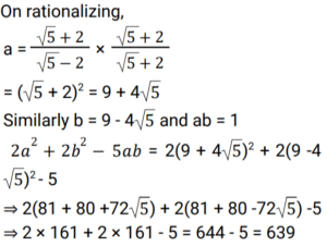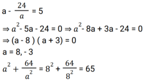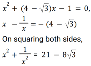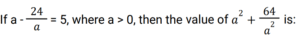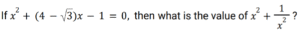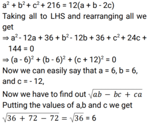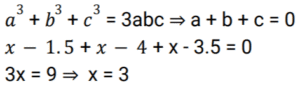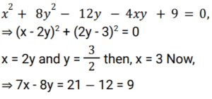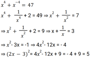 Algebra (SSC) (Part-12)Total Questions: 5141. If (𝑥 − 1.5)³ + (𝑥 − 4)³ + (𝑥 − 3.5)³ = 3(𝑥 − 1.5)(𝑥 − 4) (𝑥 − 3.5), then what is the value of x ? [SSC CHSL 10/08/2021 (Evening)](a) 1(b) 3(c) 6(d) 9Correct Answer: (b) 3Solution:42. If 𝑥⁴ + 𝑥⁻⁴ = 47, 𝑥 > 0, then the value of (2𝑥 - 3)² is: [SSC CHSL 11/08/2021 (Morning)](a) 9(b) 3(c) 5(d) 7Correct Answer: (c) 5Solution:43. If 𝑎²+ 𝑏² + 𝑐² + 48 = 8(𝑎 + 𝑏 + 𝑐), then the value of ³√(𝑎³ - 𝑏³ - 𝑐³) ? [SSC CHSL 11/08/2021 (Morning)](a) 6(b) 4(c) 3(d) 2Correct Answer: (b) 4Solution:44. Solve the following equation: [SSC CHSL 11/08/2021 (Afternoon)](a) 45(b) 56(c) 60(d) 65Correct Answer: (d) 65Solution:45. If 3x - 2y + 3 = 0 , then what will be the value of 27𝑥³ + 54𝑥𝑦 + 30 − 8𝑦³ ? [SSC CHSL 12/08/2021 (Morning)](a) - 27(b) 57(c) - 57(d) 3Correct Answer: (d) 3Solution:46. Solve the following equation: [SSC CHSL 12/08/2021 (Afternoon)](a) 693(b) 649(c) 635(d) 639Correct Answer: (d) 639Solution:47. Solve the following equation: [SSC CHSL 12/08/2021 (Evening)](a) 9 − 8√3(b) 21 − 12√3(c) 21 − 8√3(d) 17 − 8√3Correct Answer: (c) 21 − 8√3Solution:48. If 𝑎² + 𝑏² + 𝑐² + 216 = 12 × (𝑎 + 𝑏 + 2𝑐) then √𝑎𝑏 - 𝑏𝑐 - 𝑐𝑎 is: [SSC CPO 23/11/2020 (Morning)](a) 6(b) 4(c) 3(d) 8Correct Answer: (a) 6Solution:49. The value of: [SSC CPO 23/11/2020 (Evening)](a) - 3(b) 3(c) 0(d) - 1Correct Answer: (b) 3Solution:50. If 𝑥² + 8𝑦² − 12𝑦 − 4𝑥𝑦 + 9 = 0, then the value of (7x - 8y) is: [SSC CPO 23/11/2020 (Evening)](a) 12(b) 5(c) 9(d) 21Correct Answer: (c) 9Solution:Submit Quiz« Previous123456Next »