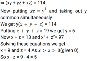 Algebra (SSC) (Part-12)Total Questions: 5151. If ๐ฅ + ๐ฆ + ๐ง = 19, ๐ฅยฒ + ๐ฆยฒ + ๐งยฒ = 133 ๐ฅ๐ง = ๐ฆ, ๐ฅ > ๐ง > 0, what is the value of (x - z) ? [SSC CPO 25/11/2020 (Morning)](a) - 2(b) 0(c) - 5(d) 5Correct Answer: (d) 5Solution: Submit Quiz« Previous123456
