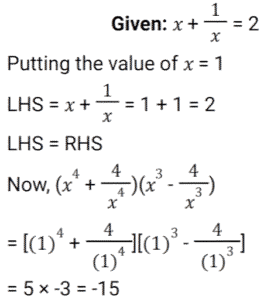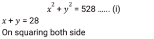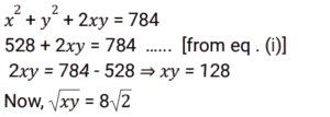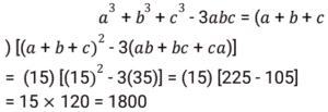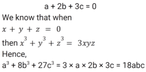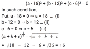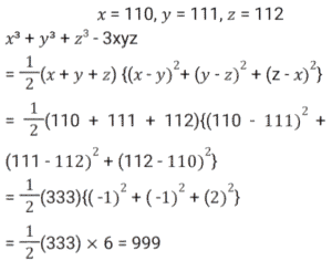 Algebra (SSC) (Part-3)Total Questions: 5031. If 𝓍 = 3y + 4, then what is the value of (𝓍³ - 27y³ - 36𝓍y) ? [SSC CPO 27/06/2024 (2nd Shift)](a) 27(b) 64(c) 16(d) 28Correct Answer: (b) 64Solution:32. Solve the following equation. [SSC CPO 27/06/2024 (3rd Shift)](a) -15(b) 15(c) -10(d) 10Correct Answer: (a) -15Solution:33. Solve the following equation. [SSC CPO 27/06/2024 (3rd Shift)](a) 9(b) 11(c) 12(d) 15Correct Answer: (b) 11Solution:34. If a + 2b + 3c = 0, then what is the value of (a³ + 8b³ + 27c³ ) ? [SSC CPO 28/06/2024 (1st Shift)](a) 18 abc(b) 12 abc(c) 0(d) 6 abcCorrect Answer: (a) 18 abcSolution:35. If x = 110, y = 111, z = 112, then find the value of x³ + y³ + z³ - 3xyz. [SSC CPO 28/06/2024 (1st Shift)](a) 999(b) 991(c) 997(d) 995Correct Answer: (a) 999Solution:36. Solve the following equation. [SSC CPO 28/06/2024 (2nd Shift)](a) ± 3(b) ± 6(c) ± 4(d) ± 2Correct Answer: (b) ± 6Solution:37. The sum of two numbers is 28 and the sum of their squares is 528. Find the square root of the product of both the numbers. [SSC CPO 28/06/2024 (2nd Shift)](a) 8√2(b) 2√2(c) 4√2(d) 6√2Correct Answer: (a) 8√2Solution: 38. Solve the following equation. [SSC CPO 28/06/2024 (3rd Shift)](a) 3(b) 0(c) 2(d) -3Correct Answer: (b) 0Solution:39. If 𝓍 = 11, then the value of (𝓍⁵ - 12𝓍⁴ + 12𝓍³ - 12𝓍² + 12𝓍 - 1) [SSC CPO 28/06/2024 (3rd Shift)](a) 10(b) 8(c) 9(d) 14Correct Answer: (a) 10Solution:40. If a + b + c = 15 and ab + bc + ca = 35 then find the value of a³ + b³ + c³ - 3abc. [SSC CPO 29/06/2024 (1st Shift)](a) 2100(b) 1500(c) 1200(d) 1800Correct Answer: (d) 1800Solution:Submit Quiz« Previous12345Next »