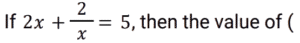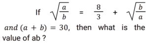 Algebra (SSC) (Part-4)Total Questions: 5021. If (x - 2) is a factor of (2x² + 12kx - 25k), then what is the value of k? [SSC MTS 01/09/2023 (2nd Shift)](a) 2(b) 8(c) 4(d) 6Correct Answer: (b) 822. Solve the following equation. [SSC CHSL 02/08/2023 (1st Shift)](a) 81/11(b) 81/7(c) 71/8(d) 81/8Correct Answer: (d) 81/823. If (a - b) = 9 and (a³ - b³) = 4401, find the value of ab. [SSC CHSL 02/08/2023 (2nd Shift)](a) 190(b) 112(c) 162(d) 136Correct Answer: (d) 13624. Solve the following equation: [SSC CHSL 02/08/2023 (2nd Shift)](a) 22.5(b) 34(c) 25.5(d) 36Correct Answer: (c) 25.525. Solve the following equation: [SSC CHSL 02/08/2023 (3rd Shift)](a) √6(b) √10(c) √15(d) √7Correct Answer: (c) √1526. Solve the following equation: [SSC CHSL 03/08/2023 (1st Shift)](a) 64(b) 28(c) 81(d) 36Correct Answer: (c) 8127. If 2𝓍 + 3y = 9, and 𝓍y = 3, what is 8𝓍³ + 27y³ ? [SSC CHSL 03/08/2023 (1st Shift)](a) 235(b) 244(c) 243(d) 234Correct Answer: (c) 24328. Solve the following equation: [SSC CHSL 03/08/2023 (3rd Shift)](a) 5/3√3(b) 10/3√3(c) 7/3√3(d) 8/3√3Correct Answer: (b) 10/3√329. If a + b = 10 and a² + b² = 58, find the value of ab. [SSC CHSL 03/08/2023 (3rd Shift)](a) 24(b) 27(c) 30(d) 21Correct Answer: (d) 2130. If (a + b + c) ≠ 0, then (a + b + c) (a² + b² + c²- ab - bc - ca) is equal to: [SSC CHSL 03/08/2023 (4th Shift)](a) a³ + b³ - c³ - 3abc(b) a³ - b³ + c³ - 3abc(c) a³ + b³ + c³ - 3abc(d) a³ + b³ + c³ + 3abcCorrect Answer: (c) a³ + b³ + c³ - 3abcSubmit Quiz« Previous12345Next »