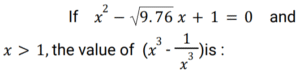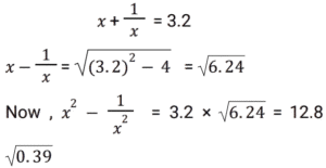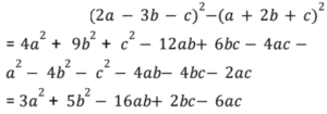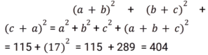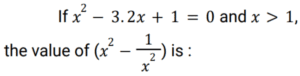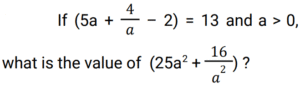 Algebra (SSC) (Part-5)Total Questions: 5011. Solve the following equation. [SSC CHSL 10/08/2023 (2nd Shift)](a) 9(b) 16(c) 4(d) 1Correct Answer: (a) 9Solution:12. If 2𝑥 + 5𝑦 = 15 and 𝑥𝑦 = 6, then the value of 4𝓍² + 25y² is_______ . [SSC CHSL 10/08/2023 (3rd Shift)](a) 105(b) 95(c) 100(d) 90Correct Answer: (a) 105Solution:13. Solve the following equation: [SSC CHSL 10/08/2023 (3rd Shift)](a) 21.042(b) 24.024(c) 21.024(d) 24.042Correct Answer: (c) 21.024Solution:14. Solve the following equation: [SSC CHSL 10/08/2023 (4th Shift)](a) 158(b) 157(c) 185(d) 175Correct Answer: (c) 185Solution:15. Simplify the given expression. [SSC CHSL 10/08/2023 (4th Shift)](a) х - у(b) x² - y²(c) x + y(d) x² + y²Correct Answer: (b) x² - y²Solution:16. If (a + b + c) = 17, and (a² + b² + c²) = 115, find then value of (a + b)² + (b + c)² + (c + a)². [SSC CHSL 11/08/2023 (2nd Shift)](a) 402(b) 408(c) 394(d) 404Correct Answer: (d) 404Solution:17. Simplify : (2a - 3b - c)² - (a + 2b + c)² [SSC CHSL 11/08/2023 (2nd Shift)](a) 3a² + 5b² - 16ab + 2bc - 8ac(b) 3a² + 5b² - 8ab + 2bc - 6ac(c) 3a² + 5b² - 16ab - 6ac(d) 3a² + 5b² - 16ab + 2bc - 6acCorrect Answer: (d) 3a² + 5b² - 16ab + 2bc - 6acSolution:18. Solve the following equation: [SSC CHSL 11/08/2023 (3rd Shift)](a) 16.8√0.39(b) 12.8√0.39(c) 16.8√0.32(d) 12.8√0.32Correct Answer: (b) 12.8√0.39Solution:19. If 𝓍² + y² + z² = 2(𝓍 + z - 1), then the value of 𝓍³ + y³ + z³ is equal to: [SSC CHSL 11/08/2023 (3rd Shift)](a) 6(b) 1(c) 2(d) 8Correct Answer: (c) 2Solution:20. If x + 3y = 6, what is the value of x³ + 27y³ + 54xy? [SSC CHSL 14/08/2023 (1st Shift)](a) 264(b) 258(c) 216(d) 220Correct Answer: (c) 216Solution:Submit Quiz« Previous12345Next »