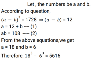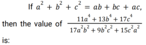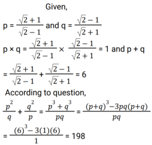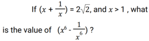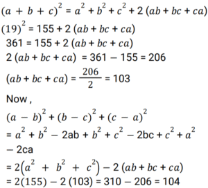 Algebra (SSC) (Part-5)Total Questions: 5041. Solve the following equation? [SSC CGL 17/07/2023 (4th shift)](a) 23/7(b) 24/9(c) 50/3(d) 100/7Correct Answer: (c) 50/3Solution:42. The cube of the difference between two given natural numbers is 1728, while the product of these two given numbers is 108. Find the positive difference between the cubes of these two given numbers. [SSC CGL 18/07/2023 (1st shift)](a) 4104(b) 5616(c) 2160(d) 5626Correct Answer: (b) 5616Solution:43. If (a + b + c) = 19, and (a² + b² + c²) = 155, find the value of (a - b)² + (b - c)² + (c - a)². [SSC CGL 18/07/2023 (2nd shift)](a) 104(b) 108(c) 100(d) 98Correct Answer: (a) 104Solution:44. Solve the following equation: [SSC CGL 18/07/2023 (3rd shift)](a) 1(b) 2(c) 11(d) 4Correct Answer: (a) 1Solution:45. The square of the difference between two given natural numbers is 324, while the product of these two given numbers is 144. Find the positive difference between the squares of these two given numbers. [SSC CGL 18/07/2023 (3rd shift)](a) 630(b) 540(c) 450(d) 360Correct Answer: (b) 540Solution:46. Solve the following equation: [SSC CGL 18/07/2023 (4th shift)](a) 200(b) 196(c) 198(d) 188Correct Answer: (c) 198Solution:47. Solve the following equation: [SSC CGL 19/07/2023 (1st shift)](a) 140√2(b) 116√2(c) 144√2(d) 128√2Correct Answer: (a) 140√2Solution:48. If (a + b + c) = 12 , and (a² + b² + c²) = 50, find the value of (a³ + b³ + c³ - 3abc). [SSC CGL 19/07/2023 (2nd shift)](a) 36(b) 24(c) 42(d) 48Correct Answer: (a) 36Solution:49. Solve the following equation: [SSC CGL 19/07/2023 (2nd shift)](a) 47/9(b) 49/9(c) 41/9(d) 43/9Correct Answer: (d) 43/9Solution:50. If x² - 7x + 1 = 0, and 0 < x < 1, what is the value of x² - (1/𝓍²) ? [SSC CGL 19/07/2023 (3rd shift)](a) 21√5(b) -21√5(c) 28√5(d) -28√5Correct Answer: (b) -21√5Solution:Submit Quiz« Previous12345
