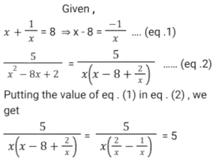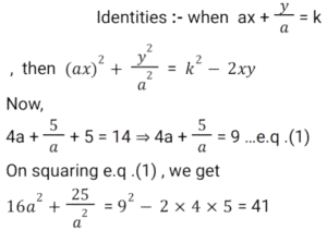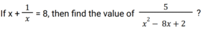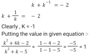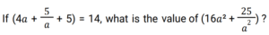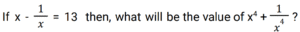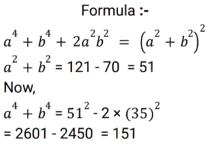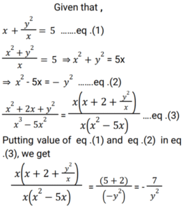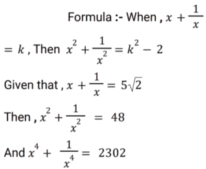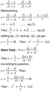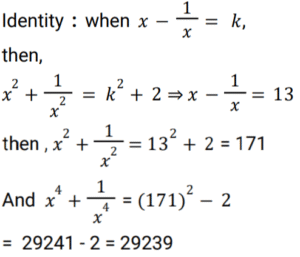 Algebra (SSC) (Part-7)Total Questions: 5031. x is a negative number such that k + k⁻¹ = - 2, then what is the value of: [SSC CGL 01/12/2022 (2nd Shift)](a) 7(b) 1(c) - 7(d) - 1Correct Answer: (b) 1Solution:32. Solve the following equation: [SSC CGL 01/12/2022 (2nd Shift)](a) 2542(b) 2650(c) 2452(d) 2302Correct Answer: (d) 2302Solution:33. If a + b = 11 and ab = 35, then what is the value of (a⁴ + b⁴) ? [SSC CGL 01/12/2022 (3rd Shift)](a) 151(b) 261(c) 124(d) 102Correct Answer: (a) 151Solution:34. If x + y = 36, then find (𝓍 - 27)³ + (y - 9)³. [SSC CGL 01/12/2022 (3rd Shift)](a) 1(b) 81(c) 2y(d) 0Correct Answer: (d) 0Solution:35. Solve the following equation: [SSC CGL 01/12/2022 (4th Shift)](a) 8(b) 4(c) 12(d) 5Correct Answer: (a) 8Solution:36. Solve the following equation: [SSC CGL 02/12/2022 (1st Shift)](a) 350(b) 345(c) 284(d) 322Correct Answer: (d) 322Solution:37. Simplify: [SSC CGL 02/12/2022 (2nd Shift)](a) 5/y²(b) 7/y²(c) -(5/y²)(d) -(7/y²)Correct Answer: (d) -(7/y²)Solution:38. Solve the following equation: [SSC CGL 02/12/2022 (4th Shift)](a) 3(b) 4(c) 0(d) 5Correct Answer: (d) 5Solution:39. Solve the following equation: [SSC CGL 03/12/2022 (1st Shift)](a) 25(b) 36(c) 41(d) 40Correct Answer: (c) 41Solution:40. Solve the following expression: [SSC CGL 03/12/2022 (1st Shift)](a) 28561(b) 29243(c) 27887(d) 29239Correct Answer: (d) 29239Solution:Submit Quiz« Previous12345Next »