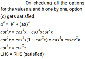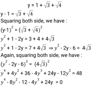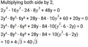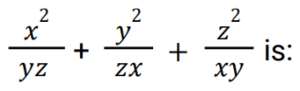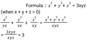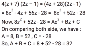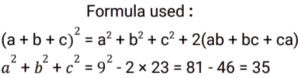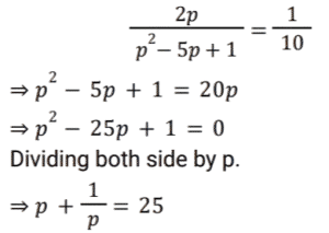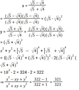 Algebra (SSC) (Part-8)Total Questions: 5021. If y = 1 + √3 + √4, then the value of 2y⁴ - 8y³ - 6y² + 28y - 84 is: [SSC CGL 08/12/2022 (2nd Shift)](a) 40√3(b) 80√3(c) 20√3(d) 60√3Correct Answer: (a) 40√3Solution: 22. Solve the following equation: [SSC CGL 08/12/2022 (2nd Shift)](a) 361/363(b) 341/343(c) 384/387(d) 321/323Correct Answer: (d) 321/323Solution:23. Solve the following equation: [SSC CGL 08/12/2022 (2nd Shift)](a) 10(b) 25(c) 1(d) 15Correct Answer: (b) 25Solution:24. Which of the following will satisfy a² = b² + (ab)b² for the values a and b ? [SSC CGL 08/12/2022 (3rd Shift)](a) a = sin x , b = cot x(b) a = cos x , b = tan x(c) a = cot x , b = cos x(d) a = sin x , b = tan xCorrect Answer: (c) a = cot x , b = cos xSolution:25. If abc = 5, what is the value of: [SSC CGL 08/12/2022 (3rd Shift)](a) 5(b) 1(c) 1/5(d) (a + b + c)Correct Answer: (b) 1Solution:26. If 4(z + 7) (2z – 1) = Az² + Bz + C, then the value of A + B + C is: [SSC CGL 08/12/2022 (3rd Shift)](a) 28(b) 32(c) 74(d) 81Correct Answer: (b) 32Solution:27. Factorize the following expression: p³ + 27. [SSC CGL 08/12/2022 (3rd Shift)](a) (p - 3) (p² - 3p + 9)(b) (p + 3) (p² + 3p + 9)(c) (p + 3) (p² - 3p + 9)(d) (p + 3) (p² - 3p - 9)Correct Answer: (c) (p + 3) (p² - 3p + 9)Solution:28. What is the value of a² + b² + c², if a + b + c = 9 and ab + bc + ca = 23 ? [SSC CGL 08/12/2022 (4th Shift)](a) 22(b) 32(c) 49(d) 35Correct Answer: (d) 35Solution:29. Solve the following equation: [SSC CGL 08/12/2022 (4th Shift)](a) 82(b) 76(c) 86(d) 78Correct Answer: (b) 76Solution:30. If x + y + z = 0, then the value of :- [SSC CGL 09/12/2022 (1st Shift)](a) 3(b) 1(c) 0(d) 2Correct Answer: (a) 3Solution:Submit Quiz« Previous12345Next »