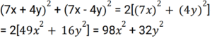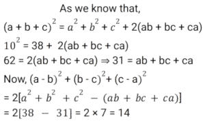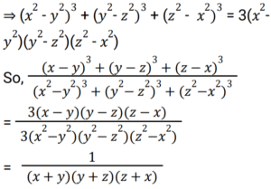 Algebra (SSC) (Part-9)Total Questions: 501. Solve the equation ? [SSC CGL 13/12/2022 (4th Shift)](a) 554(b) 288(c) -288(d) 144Correct Answer: (b) 288Solution:2. If x⁴ + x⁻⁴ = 47, x > 0, then what is the value of x + (1/𝓍) - 2 ? [SSC CPO 09/11/2022 (Morning)](a) 1(b) 0(c) 5(d) 3Correct Answer: (a) 1Solution:3. The value of: [SSC CPO 09/11/2022 (Afternoon)](a) 0(b) 1/(𝑥 + 𝑦 + 𝑧)(c) 1/(𝑥 + 𝑦)(𝑦 + 𝑧)(𝑧 + 𝑥)(d) 1Correct Answer: (c) 1/(𝑥 + 𝑦)(𝑦 + 𝑧)(𝑧 + 𝑥)Solution: 4. If a + b + c = 10 ; a² + b² + c² = 38, what is the value of (a - b)² + (b - c)² + (c - a)² ? [SSC CPO 09/11/2022 (Afternoon)](a) 15(b) 12(c) 14(d) 13Correct Answer: (c) 14Solution:5. Solve the following equation: [SSC CPO 09/11/2022 (Evening)](a) 9/4(b) 11/4(c) 6/4(d) 7/4Correct Answer: (a) 9/4Solution:6. The value of:- [SSC CPO 09/11/2022 (Evening)](a) m + n(b) m − n(c) 2(d) m/nCorrect Answer: (c) 2Solution:7. If x + y + z = 8, and x² + y² + z² = 20 then the value of x³ + y³ + z³ - 3xyz is _______. [SSC CPO 09/11/2022 (Evening)](a) 16(b) 10(c) 15(d) – 16Correct Answer: (d) – 16Solution:8. If {(1 ÷ x) × (x³ - 2x²) + (4³ ÷ 2⁵) × 𝓍} ÷ 25 = 1, then the possible values of x is/are: [SSC CPO 09/11/2022 (Evening)](a) – 5(b) 5(c) 0(d) Both 5 and - 5Correct Answer: (d) Both 5 and - 5Solution:9. The simplified form of (7x + 4y)² + (7x − 4y)² is: [SSC CPO 10/11/2022 (Morning)](a) 98x² + 32y²(b) 98x² + 32y² – 5xy(c) 32x² + 98y²(d) 98x² − 32y²Correct Answer: (a) 98x² + 32y²Solution:10. What are the values of x and y, respectively, from the following equations? [SSC CPO 10/11/2022 (Morning)]6x + 7y = 5xy 10y - 4x = 4xy(a) 3 and 4(b) 4 and 5(c) 2 and 4(d) 2 and 5Correct Answer: (c) 2 and 4Solution:Submit Quiz12345Next »