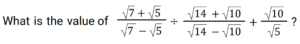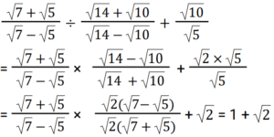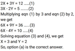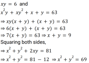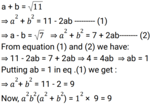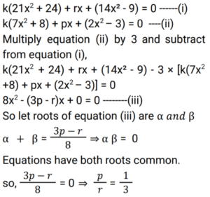 Algebra (SSC) (Part-9)Total Questions: 5021. If the equation k(21x² + 24) + rx + (14x² - 9) = 0 and k(7x² + 8) + px+ (2x² – 3) = 0 have both roots common, then the value of p/r is: [SSC CPO 11/11/2022 (Evening)](a) 1/3(b) 2/5(c) 4/3(d) 7/5Correct Answer: (a) 1/3Solution:22. Solve the following equation: [SSC CGL Tier II (08/08/2022)](a) 2 + 2(b) 2√2 + 2(c) √2 + 1(d) 2√2 + 1Correct Answer: (c) √2 + 1Solution:23. Solve the following equation: [SSC CGL Tier II (08/08/2022)](a) 6(b) 2(c) - 6(d) - 2Correct Answer: (d) - 2Solution:24. What is the solution of the following equations? [SSC CGL Tier II (08/08/2022)]2X + 3Y = 12 and 3X - 2Y = 5(a) X = 3, Y = 2(b) X = 2, Y = 3(c) X = - 2, Y = 3(d) X = 3, Y = - 2Correct Answer: (a) X = 3, Y = 2Solution:25. If xy = - 6 and 𝓍 + y = 19 (x and y are integers), then what is the value of: [SSC CGL Tier II (08/08/2022)](a) -1(b) -2(c) 1(d) 2Correct Answer: (c) 1Solution:26. Solve the following equation: [Graduate Level 01/08/2022 (Shift - 4)](a) 1(b) – (1/2)(c) 0(d) 3/2Correct Answer: (c) 0Solution:27. If (a + b) = √11 and (a - b) = √7 then find the value of a² b² (a² + b²). [Graduate Level 01/08/2022 (Shift - 4)](a) 11(b) 7(c) 5(d) 9Correct Answer: (d) 9Solution:28. If arithmetic and geometric mean of x and y is 8 and 3√7, respectively, then the of 𝓍³ + y³ is: [Graduate Level 01/08/2022 (Shift - 4)](a) 1072(b) 945(c) 559(d) 855Correct Answer: (a) 1072Solution:29. The algebraic expression 25x² + 16y² + 9z² - 40xy + 24yz - 30zx is equal to: [Graduate Level 02/08/2022 (Shift - 3)](a) (4y + 3z - 5x)(4x + 5y - 3z)(b) (4y - 3z - 5x)(4x + 5y + 3z)(c) (4y + 3z - 5x)²(d) (4y - 3z - 5x)²Correct Answer: (c) (4y + 3z - 5x)²Solution:30. If xy = 6 and x²y + xy² + x + y = 63, then the value of x² + y² is: [Graduate Level 02/08/2022 ( Shift - 3)](a) 69(b) 59(c) 70(d) 79Correct Answer: (a) 69Solution:Submit Quiz« Previous12345Next »
