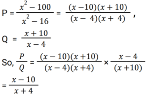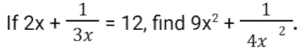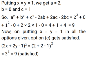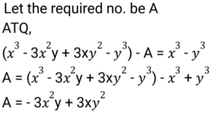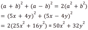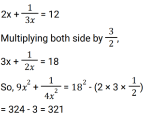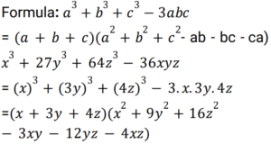 Algebra (SSC) (Part-9)Total Questions: 5031. Factorize the given algebraic expression. x³ + 27y³ + 64z³ - 36xyz [Graduate Level 02/08/2022 (Shift - 3)](a) (x - 3y - 4z)(x² + 9y² + 16z² - 3xy - 12yz - 4xz)(b) (x + 3y + 4z)(x² + 9y² + 16z² - 3xy - 12yz - 4xz)(c) (x + 3y + 4z)(x² + 9y² + 16z² - 12xy - 3yz - 4xz)(d) (x + 3y + 4z)(x² + 9y² + 16z² + 3xy + 12yz + 4xz)Correct Answer: (b) (x + 3y + 4z)(x² + 9y² + 16z² - 3xy - 12yz - 4xz)Solution:32. Simplify (5x + 4y)² + (5x - 4y)² [Graduate Level 03/08/2022 (Shift - 3)](a) 32x² + 50y²(b) 50x² + 32y²(c) - 80xy(d) 80xyCorrect Answer: (b) 50x² + 32y²Solution:33. What must be subtracted from 𝓍³ - 3𝓍²y + 3xy² - y³ to get 𝓍³ - y³ ? [Graduate Level 04/08/2022 (Shift - 2)](a) -3𝓍²y + 3xy²(b) 3𝓍²y - 3xy²(c) 𝓍³ - y³(d) -𝓍³ + y³Correct Answer: (a) -3𝓍²y + 3xy²Solution:34. If a - b = 10 and ab = 4, then the value of a³ - b³ + 4(a+ b)² is: [Graduate Level 04/08/2022 (Shift - 2)](a) 1500(b) 1584(c) 1280(d) 1623Correct Answer: (b) 1584Solution:35. Find the value of a² + b² + c² - 2ab + 2ac - 2bc, if a = x + y, b = x - y and c = 2x - 1. [Graduate Level 04/08/2022 (Shift - 4)](a) (x - y - 1)²(b) 0(c) (2x + 2y - 1)²(d) (2x - 2y - 1)²Correct Answer: (c) (2x + 2y - 1)²Solution:36. Solve the following equation: [Graduate Level 05/08/2022 (Shift - 3)](a) 18(b) 15(c) 10(d) 12Correct Answer: (a) 18Solution:37. Solve the following equation: [Graduate Level 05/08/2022 (Shift - 3)] (a)(b)(c)(d)Correct Answer: (b)Solution:38. Solve the following equation: [Higher Secondary 01/08/2022 (Shift - 3)](a) 15(b) 18(c) 10(d) 12Correct Answer: (a) 15Solution:39. Solve the following equation: [Higher Secondary 03/08/2022 (Shift - 4)](a) 16(c) 17(b) 18(d) 27Correct Answer: (c) 17Solution:40. Solve the following equation: [Higher Secondary 04/08/2022 (Shift - 3)](a) 142(b) 324(c) 321(d) 327Correct Answer: (c) 321Solution: Submit Quiz« Previous12345Next »