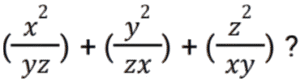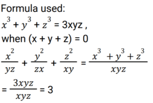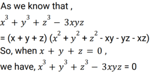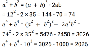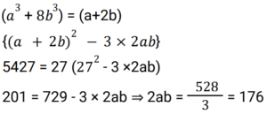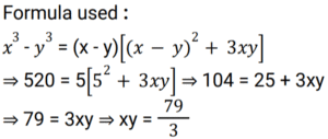 Algebra (SSC) (Part-9)Total Questions: 5041. Solve the following equation: [Higher Secondary 05/08/2022 (Shift - 2)](a) 1/4(b) 8(c) 1/8(d) 4Correct Answer: (c) 1/8Solution:42. If x - y = 5 and x³ - y³ = 520 , then the value of xy is : [Higher Secondary 05/08/2022 (Shift - 2)](a) 79/3(b) 36/5(c) 34/3(d) 76/5Correct Answer: (a) 79/3Solution:43. If x + y + z = 0, then what will be the value of: [SSC CHSL 24/05/2022 (Morning)](a)(b)(c)(d)Correct Answer: (d)Solution:44. If 2a + b = 10, 2ab = 9, and 2a > b, then find the value of 2a – b. [SSC CHSL 24/05/2022 (Afternoon)](a) 12(b) 6(c) 8(c) 8Correct Answer: (c) 8Solution:45. If a + b = 12 and ab = 35, find the value of a⁴ + b⁴ - 10³ ? [SSC CHSL 24/05/2022 (Afternoon)](a) 2226(b) 2026(c) 2126(d) 1226Correct Answer: (b) 2026Solution:46. If a + 2b = 27 and a³ + 8b³ = 5427 , then find the value of 2ab. [SSC CHSL 24/05/2022 (Evening)](a) 176(b) 156(c) 172(d) 149Correct Answer: (a) 176Solution:47. If 𝓍² = b - a𝓍 and 𝓍³ (𝓍³ + c) = d, then which of the following can be the values of c and d ? [SSC CHSL 25/05/2022 (Morning)](a) 𝑐 = 𝑎³ - 3𝑎𝑏 𝑎𝑛𝑑 𝑑 = 𝑏³(b) 𝑐 = -𝑎³ - 3𝑎𝑏 𝑎𝑛𝑑 𝑑 = 𝑏³(c) 𝑐 = 𝑎³ + 3𝑎𝑏 𝑎𝑛𝑑 𝑑 = 𝑏³(d) 𝑐 = 𝑎³ + 3𝑎𝑏 𝑎𝑛𝑑 𝑑 = -𝑏³Correct Answer: (c) 𝑐 = 𝑎³ + 3𝑎𝑏 𝑎𝑛𝑑 𝑑 = 𝑏³Solution:48. If 𝓍 + y + z = 0, then find the value of 𝓍³ + y³ + z³ - 3𝓍yz. [SSC CHSL 25/05/2022 (Afternoon)](a) 1(b) 𝓍³ + y³ + z³(c) 0(d) 3𝓍yzCorrect Answer: (c) 0Solution:49. Solve the following equation: [SSC CHSL 25/05/2022 (Evening)] (a)(b)(c)(d)Correct Answer: (a)Solution:50. If p = 11, then the value of p(p² + 3p + 3) is: [SSC CHSL 25/05/2022 (Evening)](a) 1629(b) 1225(c) 1727(d) 1111Correct Answer: (c) 1727Solution:Submit Quiz« Previous12345