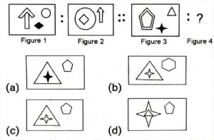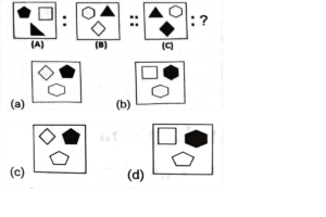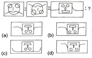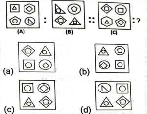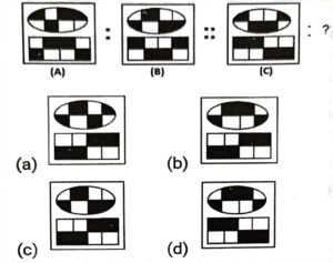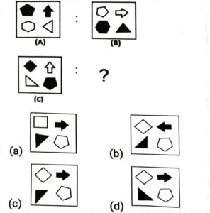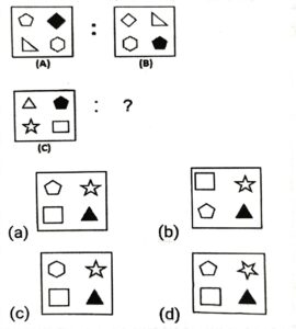Analogy Non VerbalTotal Questions: 2711. Select the option which has the same relation with figure C as figure B is related to figure A.(a)(b)(c)(d)Correct Answer: (b)12. Select the option which has the same relation with figure C as figure B is related to figure A.(a)(b)(c)(d)Correct Answer: (c)13. Select the option that is related to figure C in the same way as figure B is related to figure A.(a)(b)(c)(d)Correct Answer: (d)14. Select the option that is related to figure C in the same way as figure B is related to figure A.(a)(b)(c)(d)Correct Answer: (a)15. Select the option figure that is related to the third figure in the same way as the second figure is related to the first figure.(a)(b)(c)(d)Correct Answer: (a)16. Select the option figure that is related to the third figure in the same way as the second figure is related to the first figure.(a)(b)(c)(d)Correct Answer: (c)17. Select the option which has the same relation with the figure C as the relation of B with the figure A.(a)(b)(c)(d)Correct Answer: (c)18. Select the option which is related to figure C as is the relation of figure B to figure A.(a)(b)(c)(d)Correct Answer: (a)19. Select the option that the third figure has the same relation as the second figure is to the first figure.(a)(b)(c)(d)Correct Answer: (b)20. Select the option that the third figure has the same relation as the second figure is to the first figure.(a)(b)(c)(d)Correct Answer: (b)Submit Quiz« Previous123Next »
