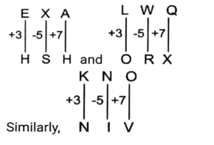 Analogy – Railway reasoning part IVTotal Questions: 5041. Select the option that is related to the fifth number in the same way as the second number is related to the first number and the fourth number is related to the third number. [Group-D 20/09/2022 (Afternoon)]23 : 44 : 35 : 56 : 43 : ?(a) 70(b) 66(c) 63(d) 64Correct Answer: (d) 64Solution:1st number + 21 = 2nd number In 23 : 44 ⇒ 23 + 21 = 44 In 35 : 56 ⇒ 35+ 21 = 56 Similarly, 43 : ? 43 + 21 = 6442. Select the option that is related to the fifth letter cluster in the same way as the second letter - cluster is related to the first letter-cluster and the fourth letter cluster is related to the third letter cluster. [Group-D 20/09/2022 (Evening)]EXA : HSH :: LWQ : ORX :: KNO : ?(a) NIV(b) MIW(c) MIV(d) NHWCorrect Answer: (a) NIVSolution:43. Select the set in which the numbers are related in the same way as are the numbers of the following sets. [Group - D 20/09/2022 (Evening)](NOTE: Operations should be performed on the whole numbers, without breaking down the numbers into its constituent digits.) (7, 5, 16807) (8, 4, 4096)(a) (10, 3, 100)(b) (12,3, 1728)(c) (8, 6, 3456)(d) (3, 4, 21)Correct Answer: (b) (12,3, 1728)Solution:(1st number) 2nd number = 3rd number In (7, 5, 16807) ⇒ 7⁵ = 16807 In (8, 4, 4096) ⇒ 8⁴ = 4096 Similarly, In (12, 3, 1728) ⇒ 12³= 172844. Select the option that is related to the fifth number in the same way as the second number is related to the first number and the fourth number is related to the third number. [Group-D 22/09/2022 (Morning)](NOTE: Operations should be performed on the whole numbers, without breaking down the numbers into its constituent digits.) 10 : 21 : 11 : 23 : 12 : ?(a) 24(b) 26(c) 25(c) 23Correct Answer: (c) 25Solution:(1st number x 2 + 1) = 2nd number In 10 : 21 ⇒ 10 × 2 + 1 = 21 In 11: 23 ⇒ 11 × 2 + 1 = 23 Similarly, In 12 : ?⇒ 12 x 2 +1 = 2545. Select the set in which the numbers are related in the same way as are the numbers of the following sets. [Group-D 22/09/2022 (Morning)](NOTE: Operations should be performed on the whole numbers, without breaking down the numbers into its constituent digits.) (63, 72) (28, 32)(a) (64, 56)(b) (42,48)(c) (56, 63)(d) (40, 48)Correct Answer: (b) (42,48)Solution:(63,72) ⇒ 7 × 9 = 63, 8 × 9 = 72 (28,32) ⇒ 7 × 4 = 28, 8 x 4 = 32 Similarly, (42,48) ⇒ 7 × 6 = 42, 8 × 6 = 4846. Select the option that is related to the fifth number in the same way as the second number is related to the first number and the fourth number is related to the third number. [Group-D 22/09/2022 (Afternoon)](NOTE: Operations should be performed on the whole numbers, without breaking down the numbers into its constituent digits.) 2 : 7 : 8 : 13 : 16 : ?(a) 21(b) 20(c) 22(d) 19Correct Answer: (a) 21Solution:Logic used : first number + 5 = second number In 2 : 72 + 5 = 7 In 8 : 13 ⇒ 8 + 5 = 13 Similarly, In 16 : ? ⇒ 16+ 5 = 2147. Select the option that is related to the fifth number in the same way as the second number is related to the first number and the fourth number is related to the third number. [Group-D 22/09/2022 (Evening)]2 : 18 : 4 : 74 : 9 : ?(a) 348(b) 517(c) 739(d) 1005Correct Answer: (c) 739Solution:2nd number = (1st number)³ + 10 In 2 : 18 ⇒ 2³ +10 = 8 + 10 = 18 In 4 : 74 ⇒ 4³ + 10 = 64 + 10 = 74 Similarly, In 9 : ? ⇒ 9³ + 10 = 729 + 10 = 73948. In the given letter-cluster pairs, the first letter-cluster is related to the second letter-cluster following a certain logic. Study the given pairs carefully, and from the given options, select the pair that follows the same logic. [Group-D 22/09/2022 (Evening)]AOE : FUJ RKT : WQY(a) CRU: HXY(b) JPM: OUS(c) QEI: VKN(d) DPJ: JUPCorrect Answer: (c) QEI: VKNSolution:1st letter + 5, 2nd letter + 6, 3rd letter + 5 In AOE : FUJ ⇒ A + 5 = F, 0 + 6 = U, E + 5 = J In RKT : WQY ⇒ R + 5 = W, K + 6 = Q, T + 5 = Y Similarly, In QEI : VKN ⇒ Q + 5 = V, E+ 6 = K, 1+5 = N49. In the given letter-cluster pairs, the first letter-cluster is related to the second letter-cluster following a certain logic. Study the given pairs carefully, and from the given options, select the pair that follows the same logic. [Group-D 26/09/2022 (Morning)]QJD : TMG GMS : JPV(a) MYO : PQJ(b) NIH : SXB(c) RPH : USK(d) AWL : ZDTCorrect Answer: (c) RPH : USKSolution:In QJD : TMG ⇒ Q + 3=T, J + 3 = M, D+3 = G In GMS : JPV ⇒ G + 3 = J, M + 3 = P, S+3 = V Similarly, In RPH : USK ⇒ R + 3 = U, P + 3 = S, H + 3 = K50. Select the set in which the numbers are related in the same way as are the numbers of the following sets. [Group-D 26/09/2022 (Morning)](NOTE: Operations should be performed on the whole numbers, without breaking down the numbers into its constituent digits.) (7, 19, 40) (12, 11, 47)(a) (14, 23, 74)(b) (9, 27, 72)(c) (15,31,48)(d) (16,5, 53)Correct Answer: (d) (16,5, 53)Solution:3rd number = 1st number x 3 + 2nd number In (7, 19, 40) ⇒ 7 x 3 + 19 = 21+ 19 = 40 In (12, 11, 47) ⇒ 12 × 3 + 11 = 36 +11 = 47 Similarly, In (16, 5, 53) ⇒ 16 x 3 + 5 = 48 + 5 = 53Submit Quiz« Previous12345