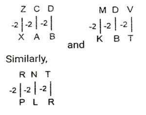 Analogy – Railway reasoning part VTotal Questions: 501. Select the option in which the numbers are related in the same way as are the numbers of the following sets. [Group-D 26/09/2022 (Morning)](NOTE: Operations should be performed on the whole numbers, without breaking down the numbers into its constituent digits.) (85, 198, 52) (77, 270, 32)(a) (61, 90, 47)(b) (62, 90, 47)(c) (62, 94, 47)(d) (62, 90, 45)Correct Answer: (b) (62, 90, 47)Solution:2nd number = (1st number - 3rd number) x 6 In (85, 198, 52) ⇒ 85 - 52 = 33, 33 × 6 = 198 In (77, 270, 32) ⇒ 77- 32 = 45, 45 × 6 = 270 Similarly, In (62, 90, 47) ⇒ 62 - 47 = 15, 15 × 6 = 902. Select the set in which the numbers are related in the same way as are the numbers of the following sets. [Group-D 26/09/2022 (Afternoon)](NOTE: Operations should be performed on the whole numbers, without breaking down the numbers into its constituent digits.) (13, 16, 21) (28, 34, 45)(a) (35, 12, 59)(b) (64, 26, 90)(c) (37, 18, 46)(d) (72, 45, 27)Correct Answer: (c) (37, 18, 46)Solution:(13, 16, 21) = 13 + 16/2 = 21 (28, 34, 45) = 28 + 34/2 = 45 In option (c) → (37, 18, 46) = 37 + 18/2 = 463. Select the set in which the numbers are related in the same way as are the numbers of the following sets. [Group-D 26/09/2022 (Afternoon)](NOTE: Operations should be performed on the whole numbers, without breaking down the numbers into its constituent digits.) (10, 150, 3) (8,80, 2)(a) (10,401,9)(b) (11,188,6)(c) (18,270, 3)(d) (12, 197, 4)Correct Answer: (c) (18,270, 3)Solution:2nd number = (1st number × 3rd number) × 5 In (10, 150, 3) ⇒ 10 × 3 × 5 = 150 In (8, 80, 2) ⇒ 8 × 2 × 5 = 80 Similarly, In (18, 270, 3) ⇒ 18 × 3 × 5 = 2704. Select the set in which the numbers are related in the same way as are the numbers of the following sets. [Group-D 26/09/2022 (Evening)](NOTE: Operations should be performed on the whole numbers, without breaking down the numbers into its constituent digits..) (13, 84, 8) (21, 136, 13)(a) (27, 140, 8)(b) (16, 23, 156)(c) (14, 56, 8)(d) (8, 71, 19)Correct Answer: (a) (27, 140, 8)Solution:(1st number + 3 rd number) x 4 In (13, 84, 8) ⇒ (13 + 8) x 4 = 21 x 4 = 84 In (21, 136, 13) ⇒ (21 + 13) x 4 = 34 × 4 = 136 Similarly, In (27, 140, 8) ⇒ (27 + 8) x 4 = 35 × 4 = 1405. Select the option that is related to the fifth letter-cluster in the same way as the second letter-cluster is related to the first letter-cluster and the fourth letter-cluster is related to the third letter-cluster. [Group-D 27/09/2022 (Morning)]ZCD : XAB :: MDV : KBT :: RNT : ?(a) PLR(b) POT(c) QRU(d) PMRCorrect Answer: (a) PLRSolution:6. Select the set in which the numbers are related in the same way as are the numbers of the following sets. [Group-D 27/09/2022 (Evening)](NOTE: Operations should be performed on the whole numbers, without breaking down the numbers into its constituent digits.) (17, 238, 7) (23, 414, 9)(a) (27, 270, 5)(b) (15,225, 15)(c) (13,273, 7)(d) (19,360, 9)Correct Answer: (a) (27, 270, 5)Solution:2nd number = (1st number x 3rd number) x 2 In (17, 238, 7) ⇒ 17 x 7 x 2 = 238 In (23, 414, 9) ⇒ 23 x 9 x 2 = 414 Similarly, In (27, 270, 5) ⇒ 27 x 5 x 2 = 2707. Select the set in which the numbers are related in the same way as are the numbers of the following sets. [Group-D 27/09/2022 (Evening)](NOTE: Operations should be performed on the whole numbers, without breaking down the numbers into its constituent digits.) (11, 117, 2) (9, 56, 5)(a) (12, 108 ,6)(b) (13,169,2)(c) (7, 46, 1)(d) (10, 98, 2)Correct Answer: (a) (12, 108 ,6)Solution:2nd number = (1st number)² - (3rd number)² In (11, 117, 2) ⇒ 11² - 2² = 121 - 4 = 117 In (9, 56, 5) ⇒ 9² - 5² = 81 - 25 = 56 Similarly, In (12, 108, 6) ⇒ 12² - 6² = 144 - 36 = 1088. Select the option that is related to the third term in the same way as the second term is related to the first term and the sixth term is related to the fifth term. [Group-D 28/09/2022 (Morning)]12 : 20 :: 30 : ? :: 56 : 72(a) 42(b) 45(c) 41(d) 44Correct Answer: (a) 42Solution:(n-1) x n : n x (n+1) 12 : 20 ⇒ 3 x 4 : 4 x 5 30 : 42 ⇒ 5× 6 : 6 × 7 56 : 72 ⇒ 7× 8 : 8 x 9 Hence, ? = 429. In the given letter-cluster pairs, the first letter-cluster is related to the second letter-cluster following a certain logic. Study the given pairs carefully, and from the given options, select the pair that follows the same logic. [Group-D 28/09/2022 (Morning)]YVQ : TQL WKG : RFB(a) SIY : NDT(b) DUR : APM(c) FHL : CIU(d) QHK : JSPCorrect Answer: (a) SIY : NDTSolution:In YVQ : TQL ⇒ Y - 5 = T, V - 5 = Q, Q - 5 = L In WKG : RFB ⇒ W - 5 = R, K - 5 = F G - 5 = B Similarly, In SIY : NDT ⇒ S - 5 = N, I - 5 = D, Y - 5 = T10. Select the option that is related to the third term in the same way as the second term is related to the first term and the sixth term is related to the fifth term. [Group-D 28/09/2022 (Afternoon)]20 : 30 :: 42 : ? :: 72 : 90(a) 55(b) 51(c) 52(d) 56Correct Answer: (d) 56Solution:In 20 : 30 ⇒ 10 (2 : 3) In 42 : ? ⇒ 14 (3 : 4) In 72 : 90 ⇒ 18 (4 : 5)Submit Quiz12345Next »