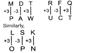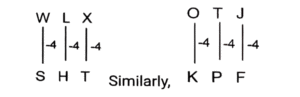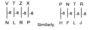 Analogy – Railway reasoning part VTotal Questions: 5041. Select the option that is related to the third term in the same way as the second term is related to the first term and the sixth term is related to the fifth term. [Group-D 11/10/2022 (Evening)]15 : 4913 :: 8 : ? :: 11 : 2197(a) 1003(b) 1001(c) 1000(d) 1002Correct Answer: (c) 1000Solution:15 : 4913 :: 8 : ? : 11 : 2197 Logic : (1st number): (1st number + 2)³ 15 : 4913 = (15 + 2)³ = 4913 11 : 2197 = (11 + 2)³ = 2197 Similarly, 8:?= (8 + 2)³ = 100042. Select the option that is related to the third term in the same way as the second term is related to the first term and the sixth term is related to the fifth term. [Group-D 11/10/2022 (Evening)]32 : 56 : 52 : ? :: 42 : 66(a) 75(b) 73(c) 76(d) 71Correct Answer: (c) 76Solution:32 : 56 = 56 - 32 = 24 42 : 66 = 66 - 42 = 24 Similarly, 52 : ? = ? - 52 = 24 So, ? = 7643. Select the option that is related to the fifth letter-cluster in the same way as the second letter-cluster is related to the first letter-cluster and the fourth letter-cluster is related to the third letter-cluster. [Level 6 (09/05/2022) Shift 1]MDT : PAW :: RFQ : UCT :: LSK : ?(a) JPH(b) HRN(c) OPN(d) ORHCorrect Answer: (c) OPNSolution:44. REM is related to IVN as per the English alphabetical order in the same way as DOH is related to WLS. following the same pattern, KEY is related to ______ [Level 6 (09/05/2022) Shift 2](a) QVB(b) PUC(c) QUD(d) PVBCorrect Answer: (d) PVBSolution:The letters are coded as their opposite letters. K - P, E - V, Y - B So, KEY ⇒ PVB45. JUG is related to LSI as per the English alphabetical order in the same way as WIN is related to YGP following the same pattern, APT is related to_____ [Level 4 (10/05/2022) Shift 1](a) CRR(b) CNV(c) CNR(d) CRVCorrect Answer: (b) CNVSolution:First letter + 2 Second letter - 2, Third letter + 2 Hence, A + 2 = C, P - 2 = N, T + 2 = V CNV46. Select the option that is related to the fifth letter-cluster in the same way as the fourth letter-cluster is related to the third letter-cluster and the second letter-cluster is related to the first-cluster. [Level 5 (12/06/2022) Shift 1]JEWAD : ? EYBRD : VBYIW :: DAJKO : WZQPL :(a) KRESD(b) VRTYU(c) QVDZW(d) MHREACorrect Answer: (c) QVDZWSolution:Opposite letter is coded. Opposite of J = Q Opposite of E = V Opposite of W = D Opposite of A = Z Opposite of D = W So, ?= QVDZW47. Select the option that is related to the fifth letter-cluster in the same way as the second letter-cluster is related to the first letter-cluster and the fourth letter-cluster is related to the third letter-cluster. [Level 2 (13/06/2022) Shift 1]KLC : FNL :: YCS : VEZ :: CPQ : ?(a) TRD(b) SRE(c) TSF(d) NRDCorrect Answer: (a) TRDSolution:48. Select the option that is related to the fifth letter-cluster in the same way as the second letter-cluster is related to the first letter cluster and the fourth letter-cluster is related to the third-cluster. [Level 2 (13/06/2022) Shift 1]FL : BH :: RY: NU: GM : ?(a) CI(b) DK(c) LP(d) QSCorrect Answer: (a) CISolution:FL : BH → F - 4 = B, L - 4 = H Similarly, G - 4 = C, M - 4 = I So, ? = CI49. Select the option that is related to the fifth letter-cluster in the same way as the second letter-cluster is related to the first letter cluster and the fourth letter-cluster is related to the third-cluster. [Level 2 (13/06/2022) Shift 1]VTZX : NLRP : MJVQ : EBNI :: PNTR : ?(a) FGJL(b) HFLJ(c) GFLJ(d) FHJLCorrect Answer: (b) HFLJSolution:50. Select the option that is related to the sixth letter-cluster in the same way as the first letter-cluster is related to the second letter-cluster and the third letter-cluster is related to the fourth letter-cluster. [Level 2 (13/06/2022) Shift 2]WLX: SHT :: FGJ : BCF :: ? : KPF(a) PTK(b) OSK(c) OTJ(d) PSQCorrect Answer: (c) OTJSolution:Submit Quiz« Previous12345