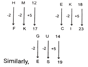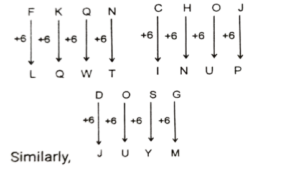 Analogy (SSC MTS 2023 Tier 1)Total Questions: 531. 287 is related to 398 following a certain logic. Following the same logic, 378 is related to 489. To which of the following is 852 related to, following the same logic? [S.S.C MTS 01/09/2023 (1st Shift)](a) 643(b) 963(c) 346(d) 543Correct Answer: (b) 963Solution:The pattern followed here is :(2nd number - 1st number) = 111 (287 : 398) → 398 - 287 = 111 (378 : 489) → 489 - 378 = 111 Similarly, (852 : x) → x - 852 = 111 ⇒ x = 852 + 111 = 963Hence, 963 is the correct answer.2. Select the word-pair that best represents a similar relationship to the one expressed in the pair of words given below. [S.S.C MTS 01/09/2023 (1st Shift)](The words must be considered as meaningful English words and must not be related to each other based on the number of letters/number of consonants/vowels in the word.)Reflection : Light(a) Sentiment : Feeling(b) Echo : Sound(c) Iris : Sight(d) Movie : SceneCorrect Answer: (b) Echo : SoundSolution:As Reflection is a property of lightSimilarly, Echo is a property of Sound.3. FKQN is related to LQWT in a certain way based on the English alphabetical order. In the same way, CHOJ is related to INUP. To which of the following is DOSG related to, following the same logic? [S.S.C MTS 01/09/2023 (2nd Shift)](a) JSWM(b) JUYM(c) IUVL(d) HQWKCorrect Answer: (b) JUYMSolution:The pattern followed here is :Hence, JUYM is the correct answer.4. 284 is related to 142 following a certain logic. Following the same logic, 612 is related to 306. To which of the following is 522 related to, following the same logic? [S.S.C MTS 01/09/2023 (2nd Shift)](a) 262(b) 261(c) 263(d) 264Correct Answer: (b) 261Solution:The pattern followed here is :(2nd number × 2) = 1st number (284 : 142) → 142 × 2 = 284 (612 : 306) → 306 × 2 = 612 Similarly,(522 : y) → y × 2 = 522 ⇒ y = (522 ÷ 2) = 261Hence, 261 is the correct answer.5. In the following number-pairs, the second number is obtained by applying certain mathematical operations to the first number. Select the set in which the numbers are related in the same way as are the numbers of the following sets. [S.S.C MTS 01/09/2023 (2nd Shift)](Note :- Operations should be performed on the whole numbers, without breaking down the numbers into its constituent digits.)(5, 24) (12, 143)(a) 27, 345(b) 14, 195(c) 18, 652(d) 21, 126Correct Answer: (b) 14, 195Solution:The pattern followed here is :(1st number)² - 1 = 2nd number (5 : 24) → 5² - 1 = 25 - 1 = 24 (12 : 143) → 12² - 1 = 144 - 1 = 143 Similarly, (14 : 195) → 14² - 1 = 196 - 1 = 195Hence, (14 : 195) is the correct answer.6. HM 12 is related to FK 17 in a certain way. In the same way, EK 18 is related to CI 23. To which of the following is GU 14 related to following the same logic? [S.S.C MTS 01/09/2023 (3rd Shift)](a) ES 19(b) IW 20(c) ER 18(d) FS 19Correct Answer: (a) ES 19Solution:The pattern followed here is :Hence, ES 19 is the correct answer.7. In the following number-pairs, the second number is obtained by applying certain mathematical operations to the first number. Select the set in which the numbers are related in the same way as are the numbers of the following sets. [S.S.C MTS 01/09/2023 (3rd Shift)](NOTE :- Operations should be performed on the whole numbers, without breaking down the numbers into its constituent digits.)16 : 95 6 : 35(a) 8 : 48(b) 13 : 77(c) 2 : 13(d) 17 : 23Correct Answer: (b) 13 : 77Solution:The pattern followed here is :(1st number × 6) - 1 = 2nd number 16 : 95 → (16 × 6) - 1 = 96 - 1 = 95 6 : 35 → (6 × 6) - 1 = 36 - 1 = 35 Similarly, 13 : 77 → (13 × 6) - 1 = 78 - 1 = 77Hence, 13 : 77 is the correct answer.8. 'DKJE' is related to 'IPOJ' in a certain way based on the English alphabetical order. In the same way, GTSM is related to LYXR. To which of the following is RBNF related to, following the same logic? [S.S.C MTS 04/09/2023 (1st Shift)](a) WGSK(b) XERJ(c) WEQK(d) VGQICorrect Answer: (a) WGSKSolution:The pattern followed here is :Hence, WGSK is the correct answer.9. 2 is related to 40 following a certain logic. Following the same logic, 5 is related to 250. To which of the following is 7 related to, following the same logic? [S.S.C MTS 04/09/2023 (2nd Shift)](a) 470(b) 490(c) 450(d) 400Correct Answer: (b) 490Solution:The pattern followed here is :(1st number)² × 10 = 2nd number 2 : 40 → 2² × 10 ⇒ 4 × 10 = 40 5 : 250 → 5² × 10 ⇒ 25 × 10 = 250 Similarly,7 : 490 → 7² × 10 ⇒ 49 × 10 = 490Hence, 490 is the correct answer.10. Select the word-pair that best represents the same relationship expressed in the pair of words given below. [S.S.C MTS 04/09/2023 (2nd Shift)](The words should be treated as meaningful Hindi words and should not be related to each other on the basis of number of letters/consonants/vowels in the word.)Appreciate : praise(a) To Treat : Serving(b) To persuade : to reject(c) To beautify : to refresh(d) Teach : learnCorrect Answer: (a) To Treat : ServingSolution:Just as appreciation and praise are synonymsSimilarly, giving a treat and serving are synonyms.Submit Quiz123456Next »