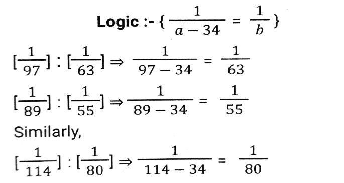 Analogy varieties Question TCS (Part – I)Total Questions: 3621. Select the option that is related to the third term in the same way as the second term is related to the first term and the sixth term is related to the fifth term. [S.S.C CGL 03/12/2022 (3rd Shift)]25 : 264 :: 31 : ? :: 49 : 456(a) 312(b) 314(c) 297(d) 961Correct Answer: (a) 312Solution:The pattern followed here is :n : {(n + 8) × 8} (25 : 264) → {(25 +8) × 8} = 264 (49 : 456) → {(49 + 8) × 8} = 456 Similarly,(31 : ?) → {(31 + 8) × 8} = 312Hence, 312 is the correct answer.22. Select the option that is related to the third number in the same way as the second number is related to the first number and the sixth number is related to the fifth number. [S.S.C CGL 02/12/2022 (4th Shift)]687 : 612 :: 713 : ? :: 621 : 546(a) 656(b) 674(c) 662(d) 638Correct Answer: (d) 638Solution:The pattern followed here is :(Difference between the given number cluster is 75) (687 : 612) → 687 - 612 = 75 (621 : 546) → 621 - 546 = 75 Similarly, let ? = y(713 : y) → 713 - y = 75y = 713 - 75y = 638Hence, 638 is the correct answer.23. Select the option that is related to the fourth term in the same way as the first term is related to the second term and the fifth term is related to the sixth [S.S.C CGL 02/12/2022 (3rd Shift)]8: 496 :: ? : 204 :: 9 : 711(a) 5(b) 13(c) 6(d) 11Correct Answer: (c) 6Solution:The pattern followed here is :a : (a³ - 2 × a) (8 : 496) → (8³ - 2 × 8) = 496 (9 : 711) → (9³ - 2 × 9) = 711Similarly,(6 : 204) → (6³ - 2 × 6) = 204Hence, 6 is the correct answer.24. Select the option that is related to the third term in the same way as the second term is related to the first term [S.S.C CGL 02/12/2022 (2nd Shift)]21 : 196 :: 29 : ? :: 38 : 315(a) 319(b) 252(c) 203(d) 841Correct Answer: (b) 252Solution:The pattern followed here is :n : {(n + 7) × 7} (21 : 196) → {(21 + 7) × 7} = 196 (38 : 315) → {(38 + 7) × 7} = 315 Similarly,(29 : 252) → {(29 + 7) × 7} = 252Hence, 252 is the correct answer.25. Select the option that is related to the third term in the same way as the second term is related to the first term and the sixth term is related to the fifth term. [S.S.C CGL 01/12/2022 (4th Shift)]24 : 840 :: 27 : ? :: 33 : 1452(a) 756(b) 297(c) 1026(d) 729Correct Answer: (c) 1026Solution:The pattern followed here is :n : {n² + (n × 11)} (24 : 840) → {24² + (24 × 11)} = 840 (33 : 1452) → {33² + (33 × 11)} = 1452 Similarly,(27 : 1026) → {27² + (27 × 11)} = 1026Hence, 1026 is the correct answer.26. Select the option that is related to the third number in the same way as the second number is related to the first number and the sixth number is related to the fifth number. [S.S.C CGL 01/12/2022 (3rd Shift)]37 : 100 :: 24 : ? :: 29 : 76(a) 64(b) 61(c) 75(d) 70Correct Answer: (b) 61Solution:The pattern followed here is :{(1st number × 3) - 11} = 2nd number (37 : 100) → {(37 × 3) - 11} = 100 (29 : 76) → {(29 × 3) - 11} = 76 Similarly,(24 : 61) → {(24 × 3) - 11} = 61Hence, 61 is the correct answer.27. Select the option that is related to the third number in the same way as the second number is related to the first number and the sixth number is related to the fifth [S.S.C CGL 01/12/2022 (2nd Shift)]12 : 16 :: 18 : ? :: 24 : 64(a) 26(b) 32(c) 28(d) 36Correct Answer: (d) 36Solution:The pattern followed here is :(a : b) → ( a ÷ 3)² = b(12 : 16) → (12 ÷ 3)² = 16(24 : 64) → (24 ÷ 3)² = 64Similarly,(18 : ?) → (18 ÷ 3)² = 36Hence, 36 is the correct answer.28. Select the set in which the numbers are related in the same way as are the numbers of the following set. [S.S.C CGL 01/12/2022 (1st Shift)](NOTE: Operations should be performed on the whole numbers, without breaking down the numbers into its constituent(3, 14, 1)(4, 36, 2)(a) (8, 12, 2)(b) (5, 81, 4)(c) (7, 40, 3)(d) (8, 260, 2)Correct Answer: (d) (8, 260, 2)Solution:The pattern followed here is :[{(1st number)3 + (3rd number)3}÷ 2] = 2nd number (3, 14, 1) → (33 + 13) ÷ 2 = 14 (4, 36, 2) → (43 + 23) ÷ 2 = 36 Similarly, (8, 260, 2) → (83 + 23) ÷ 2 = 260Hence, (8, 260, 2) is the correct answer.29. Select the set in which the numbers are related in the same way as are the numbers of the given sets. [S.S.C CPO 11/11/2022 (Morning)](NOTE: Operations should be performed on the whole numbers, without breaking down the numbers into its constituent digits.)(5, 60, 70)(9, 108, 126)(a) (7, 84, 98)(b) (4, 48, 52)(c) (6, 72, 74)(d) (8, 84, 112)Correct Answer: (a) (7, 84, 98)Solution:The pattern followed here is :{(1st number × 2) + 2nd number} = 3rd Number (5, 60, 70) → {(5 × 2) + 60} = 70 (9, 108, 126) → {(9 × 2) + 108} = 126 Similarly,(7, 84, 98) → {(7 × 2) + 84} = 98Hence, (7, 84, 98) is the correct answer.30. Select the option that is related to the third term in the same way as the second term is related to the first term and the sixth term is related to the fifth term. [S.S.C CPO 10/11/2022 (Morning)][1/97] : [1/63] :: [1/114] : ? :: [1/89] : [1/55](a) [1/80](b) [1/77](c) [1/86](d) [1/83]Correct Answer: (a) [1/80]Solution:The pattern followed here is :Hence, 1/80 is the correct answer.Submit Quiz« Previous1234Next »