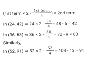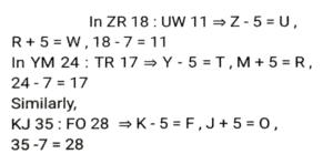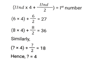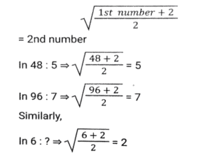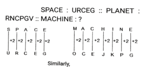Analogy – Railway reasoningTotal Questions: 5031. Select the option that is related to the fifth number in the same way as the fourth number is related to the third number and the second number is related to the first number. [Group-D 12/09/2022 (Evening)]4 : 9 :: 5 : 12 :: 3 : ?(a) 6(b) 11(c) 8(d) 7Correct Answer: (a) 6Solution:32. ZR 18 is related to UW 11 in a certain way. In the same way. YM 24 is related to TR17. To which of the following is KJ 35 related following the same logic? [Group-D 16/09/2022 (Afternoon)](a) FO 28(b) GP 27(c) FP 27(d) GO 28Correct Answer: (a) FO 28Solution:33. Select the set in which the numbers are related in the same way as are the numbers of the following sets [Group-D 16/09/2022 (Afternoon)](NOTE: Operations should be performed on the whole numbers, without breaking down the numbers into its constituent digits.) (14, 336, 8) (12, 324, 9)(a) (18,378, 7)(b) (18,368, 7)(c) (18,398, 7)(d) (18,478, 7)Correct Answer: (a) (18,378, 7)Solution:34. Select the option that is related to the third term in the same way as the second term is related to the first term and the sixth term is related to the fifth term. [Group-D 26/09/2022 (Evening)]231 : 334 :: 289 : ? :: 319 : 422(a) 394(b) 393(c) 395(d) 392Correct Answer: (d) 392Solution:35. Select the option in which the mumbers are related in the same way as are the numbers of the following sets. [Group-D 27/09/2022 (Morning)](NOTE: Operations should be performed on the whole numbers, without breaking down the numbers into its constituent digits.) (289, 192, 95) (375, 278, 181)(a) (421, 324, 225)(b) (421, 324, 227)(c) (420, 324, 227)(d) (421, 322, 227)Correct Answer: (b) (421, 324, 227)Solution:2nd number = (1st number + 3rd number) ÷ 2 ln ( 289,192,95) ⇒ (289 + 95) ÷ 2 = 192 = 192 ln (375, 278, 181) ⇒ (375+181) ÷ 2 =278 Similarly, ln ( 421, 324, 227) ⇒ (421+227)÷ 2 = 32436. Select the set in which the numbers are related in the same way as are the numbers of the following sets. [Group D 28/09/2022 (Morning)](NOTE: Operations should be performed on the whole numbers, without breaking down the numbers into its constituent digits.) (24, 42) (36, 63)(a) 52, 91(b) 40, 82(c) 48, 96(d) 36, 91Correct Answer: (a) 52, 91Solution:37. Select the option that is related to the fifth number in the same way as the second number is related to the first number. the fourth number is related to the third number. [Group-D 28/09/2022 (Morning)]48 : 5 :: 96 : 7 :: 6 : ?(a) 36(b) 10(c) 4(d) 2Correct Answer: (d) 2Solution:38. Select the option that is related to the third term in the same way as the second term is related to the first term and the sixth term is related to the fifth term. [Group-D 29/09/2022 (Morning)]27 : 6 :: 18 : ? :: 36 : 8(a) 4(b) 6(c) 3(d) 5Correct Answer: (a) 4Solution:39. Select the option that is related to the fifth term in the same way as the fourth term is related to the third term and the second term is related to the first term. [Group-D 30/09/2022 (Afternoon)]SPACE : URCEG :: PLANET : RNCPGV :: MACHINE : ?(a) OCEJKPG(b) KYAJKPG(c) KYAFGLC(d) OCEFGPGCorrect Answer: (a) OCEJKPGSolution:40. Select the option that is related to the fifth letter-cluster in the same way as the fourth letter-cluster is related to the third letter-cluster and the second letter-cluster is related to the first letter-cluster. [NTPC CBT II Level 4 (10/05/2022) Shift 1]HTWCGY : WTHCGY :: ALTMHY : TLAMHY :: LGETDR : ?(a) RDTEGL(b) EGLRTD(c) EGLTDR(d) EGTLDRCorrect Answer: (c) EGLTDRSolution:HTWCGY → WTHCGY, here first and third replace their positions while remaining alphabets are same. LGETDR → EGLTDRSubmit Quiz« Previous12345Next »