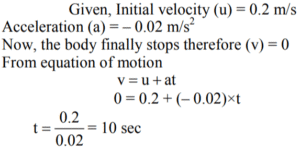 9. A body starts to slide over a horizontal surface with an initial velocity of 0.2 m/s. Due to friction, its velocity decreases at the rate of 0.02 m/s. How much time will it take for the body to stop? [BPSC AE (GEN ENGG.)- 25.03.2022]