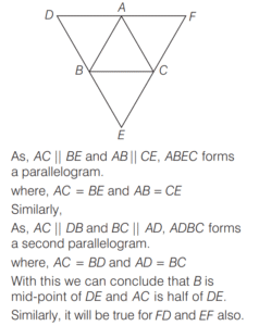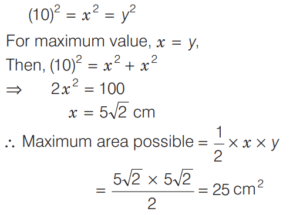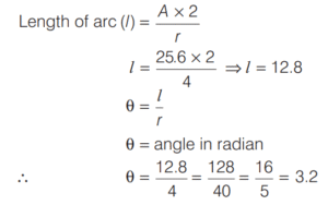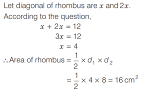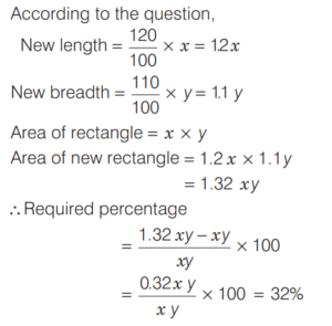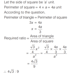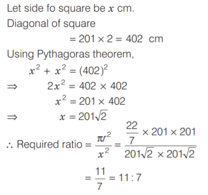 AREA AND PERIMETER (CDS)Total Questions: 1161. The area of a sector of a circle of radius 4 cm is 25.6 cm² . What is the radian measure of the arc of the sector? [2019 (II) Evening Shift](a) 2.3(b) 3.2(c) 3.3(d) 3.4Correct Answer: (b) 3.2Solution:Area of a sector = 25 6. cm²2. The perimeter of a triangle is 22 cm. Through each vertex of the triangle, a straight line parallel to the opposite side is drawn. What is the perimeter of triangle formed by these lines? [2019 (II) Evening Shift](a) 33 cm(b) 44 cm(c) 66 cm(d) 88 cmCorrect Answer: (b) 44 cmSolution: 3. If l is the length of the median of an equilateral triangle, then what is its area? [2019 (II) Evening Shift](a)(b)(c)(d)Correct Answer: (a)Solution:4. A piece of wire is in the form of a sector of a circle of radius 20 cm, subtending an angle 150° at the centre. If it is bent in the form of a circle, then what will be its radius? [2019 (II) Evening Shift](a) 19/3 cm(b) 7 cm(c) 8 cm(d) None of theseCorrect Answer: (d) None of theseSolution:Radius = 20 cm5. An equilateral triangle and a square are constructed using metallic wires of equal length. What is the ratio of area of triangle to that of square? [2019 (II) Evening Shift](a) 3 : 4(b) 2 : 3(c) 4√3 : 9(d) 2√3 : 9Correct Answer: (c) 4√3 : 9Solution:Let side of triangle be ‘x’ unit.6. All the four sides of a parallelogram are of equal length. The diagonals are in the ratio 1 : 2. If the sum of the lengths of the diagonals is 12 cm, then what is the area of the parallelogram? [2019 (II) Evening Shift](a) 9 cm²(b) 12 cm²(c) 16 cm²(d) 25 cm²Correct Answer: (c) 16 cm²Solution:If all the sides of a parallelogram is equal that mean its a rhombus.7. ABC is a triangle right angled at B. If AB = 5 cm and BC = 10 cm, then what is the length of the perpendicular drawn from the vertex B to the hypotenuse? [2019 (II) Evening Shift](a) 4 cm(b) 2√5 cm(c) 4√5 cm(d) 8 cmCorrect Answer: (b) 2√5 cmSolution:8. The length and breadth of a rectangle are increased by 20% and 10%, respectively. What is the percentage increase in the area of the rectangle? [2019 (II) Evening Shift](a) 32%(b) 30%(c) 25%(d) 15%Correct Answer: (a) 32%Solution:Let length and breadth of rectangle be x and y. 9. If the length of the hypotenuse of a right angled triangle is 10 cm, then what is the maximum area of such a right angled triangle? [2019 (II) Evening Shift](a) 100 cm²(b) 50 cm²(c) 25 cm²(d) 10 cm²Correct Answer: (c) 25 cm²Solution:10. A square is drawn such that its vertices are lying on a circle of radius 201 mm. What is the ratio of area of circle to that of square? [2019 (II) Evening Shift](a) 11 : 7(b) 7 : 11(c) 20 : 19(d) 19 : 20Correct Answer: (a) 11 : 7Solution:Submit Quiz123456789101112Next »
