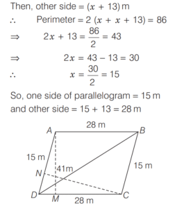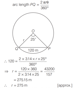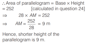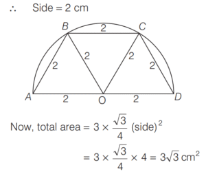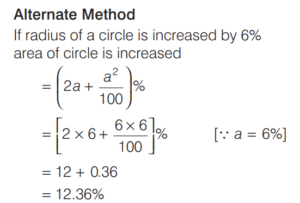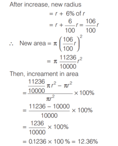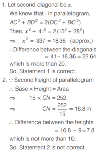 AREA AND PERIMETER (CDS)Total Questions: 116101. A railroad curve is to be laid on a circle. What radius (approximate) should be used, if the track is to change direction by 25º in a distance of 120 m? [2014 (II) Evening Shift ](a) 300 m(b) 280 m(c) 275 m(d) 264 mCorrect Answer: (c) 275 mSolution:We know that,102. What is the area of the parallelogram? [2014 (II) Evening Shift ](a) 63m²(b) 96m²(c) 126m²(d) 252m²Correct Answer: (d) 252m²Solution:Given, perimeter of parallelogram land = 86 m and diagonal = 41m. Let one side of parallelogram be x m. 103. What is the shorter height of the parallelogram? [2014 (II) Evening Shift ](a) 9.0 m(b) 7.5 m(c) 5.5 m(d) 4.5 mCorrect Answer: (a) 9.0 mSolution:From the above figure, shorter height of parallelogram = AM104. Consider the following statements [2014 (II) Evening Shift ]1. The difference between the diagonals of the parallelogram is more than 20 m. 2. The difference between the heights of the parallelogram is more than 10 m.Which of the above statement(s) is/are correct?(a) Only 1(b) Only 2(c) Both 1 and 2(d) Neither 1 nor 2Correct Answer: (a) Only 1Solution:105. If the radius of a circle is increased by 6%, then its area will increase by [2014 (II) Evening Shift ](a) 6%(b) 9%(c) 12.36%(d) 16.64%Correct Answer: (c) 12.36%Solution:Let the radius of circle = r , Then, area of a circle = πr² 106. The sides of a triangle are in the ratio 1/2 : 1/3 : 1/4. If its perimeter is 52 cm, then what is the length of the smallest side? [2014 (II) Evening Shift ](a) 9 cm(b) 10 cm(d) 12 cm(c) 11 cmCorrect Answer: (d) 12 cmSolution:Given, sides of a triangle are in the ratio = 1/2 : 1/3 : 1 4107. If every side of an equilateral triangle is doubled, then the area of new triangle becomes times the area of the old one. What is k equal to? [2014 (II) Evening Shift ](a) √3(b) 2(c) 4(d) 8Correct Answer: (c) 4Solution:Let the sides of an old triangle be a, then area of an old equilateral triangle,108. How many circular plates of diameter d be taken out of a square plate of side 2d with minimum loss of material? [2014 (I) Morning Shift](a) 8(b) 6(c) 4(d) 2Correct Answer: (c) 4Solution:From the figure, it is clear that, 4 circular plates of diameter d can be made of a square plate of side 2d with minimum loss of material.109. What is the total area of three equilateral triangles inscribed in a semi-circle of radius 2 cm? [2014 (I) Morning Shift](a)(b)(c)(d)Correct Answer: (d)Solution:Since, ∆AOB, ∆BOC and ∆COD are equilateral.110. The area of a sector of a circle of radius 36 cm is 72π cm² . The length of the corresponding arc of the sector is [2014 (I) Morning Shift](a) π cm(b) 2 π cm(c) 3 π cm(d) 4 π cmCorrect Answer: (d) 4 π cmSolution:Area of sector = 72 π cm² Submit Quiz« Previous123456789101112Next »