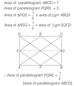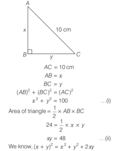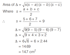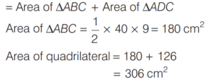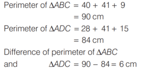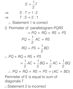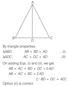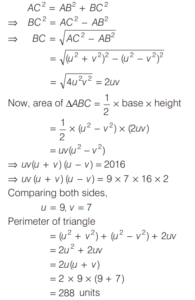 AREA AND PERIMETER (CDS)Total Questions: 11621. The angles of a triangle are in the ratio 1 : 1 : 4. If the perimeter of the triangle is k times its largest side, then what is the value of k? [2019 (I) Morning Shift](a)(b)(c)(d)Correct Answer: (a)Solution:The angle of triangle are in the ratio 1 : 1 : 4. Then, two angle are equal 22. The hypotenuse of a right angled triangle is 10 cm and its area is 24 cm². If the shorter side is halved and the longer side is doubled, the new hypotenuse becomes [2019 (I) Morning Shift](a)(b)(c)(d)Correct Answer: (c)Solution:ABC is right angle triangle at B. 23. Consider the following statements : [2019 (I) Morning Shift]1. The perimeter of a triangle is greater than the sum of its three medians. 2. In any triangle ABC, if D is any point on BC, then AB + BC + CA > 2AD.Which of the above statements is/are correct?(a) 1 only(b) 2 only(c) Both 1 and 2(d) Neither 1 nor 2Correct Answer: (c) Both 1 and 2Solution:The perimeter of a triangle is greater than the sum of its three medians. 24. (Questions 24-26) Read the given information carefully and answer the given questions below. [2019 (I) Morning Shift]ABCD is a quadrilateral with AB = 9 cm, BC = 40 cm, CD = 28 cm, DA = 15 cm and angle ABC is a right-angle. Diagram for questions (24-26)What is the area of triangle ADC ?(a) 126 cm²(b) 124 cm²(c) 122 cm²(d) 120 cm²Correct Answer: (a) 126 cm²Solution: 25. What is the area of quadrilateral ABCD ? [2019 (I) Morning Shift]Area of quadrilateral ABCD(a) 300 cm²(b) 306 cm²(c) 312 cm²(d) 316 cm²Correct Answer: (b) 306 cm²26. What is the difference between perimeter of triangle ABC and perimeter of triangle ADC? [2019 (I) Morning Shift](a) 4 cm(b) 5 cm(c) 6 cm(d) 7 cmCorrect Answer: (c) 6 cmSolution:Difference between perimeter of ∆ABC and ∆ADC.27. If base and hypotenuse of a right triangle are (u² - v²) and (u² + v²) respectively and the area of the triangle is 2016 square units, then the perimeter of the triangle may be [2018 (II) Evening Shift](a) 224 units(b) 288 units(c) 448 units(d) 576 unitsCorrect Answer: (b) 288 unitsSolution:According to the question, In right angle ∆ABC, Here,28. A circle is inscribed in an equilateral triangle of side of length e.e. The area of any square inscribed in the circle is [2018 (II) Evening Shift](a) l²/2(b) √3l²/2(c) l²/4(d) l²/6Correct Answer: (d) l²/6Solution:Side of equilateral ∆ABC = l 29. Let S be the parallelogram obtained by joining the mid-points of the parallelogram T. [2018 (II) Evening Shift]Consider the following statements 1. The ratio of area of T to that S is 2 : 1 2. The perimeter of S is half of the sum of diagonals of T.Which of the above statements is/are correct?(a) 1 only(b) 2 only(c) Both 1 and 2(d) Neither 1 nor 2Correct Answer: (a) 1 onlySolution:Given, 30. The sides of a triangle are 5 cm, 6 cm and 7 cm. The area of the triangle is approximately [2018 (II) Evening Shift](a) 14.9 cm²(b) 14.7 cm²(c) 14.5 cm²(d) 14.3 cm²Correct Answer: (b) 14.7 cm²Solution:The sides of triangles are 5cm, 6 cm and 7cm respectivelySubmit Quiz« Previous123456789101112Next »