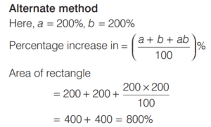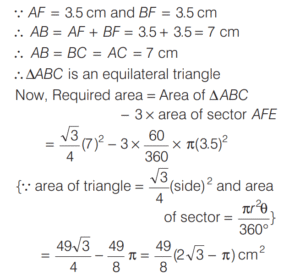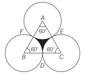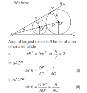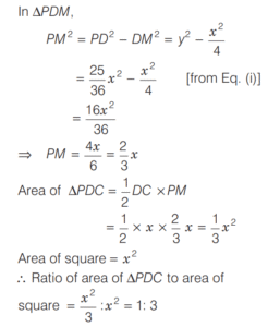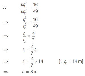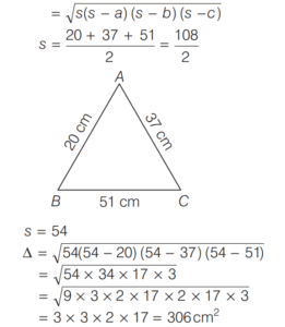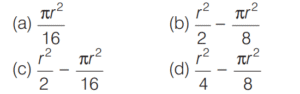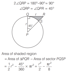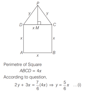 AREA AND PERIMETER (CDS)Total Questions: 11651. The diameters of two given circles are in the ratio 12 : 5 and the sum of their areas is equal to the area of a circle of diameter 65 cm. What are their radii? [2017 (II) Evening Shift ](a) 12 cm and 5 cm(b) 24 cm and 10 cm(c) 60 cm and 25 cm(d) 30 cm and 12.5 cmCorrect Answer: (d) 30 cm and 12.5 cmSolution:Let the radius of two circle are12x and 5x52. Two straight lines AB and AC include an angle. A circle is drawn in this angle which touches both these lines. One more circle is drawn which touches both these lines as well 2as the previous circle. If the area of the bigger circle is 9 times the area of the smaller circle, then what must be the angle A? [2017 (II) Evening Shift ](a) 45°(b) 60°(c) 75°(d) 90°Correct Answer: (b) 60°Solution: 53. An isosceles triangle is drawn outside on one of the sides of a square as base in which a way that the perimeter of the complete figure is 7/6 times the perimeter of the original square. What is the ratio of area of the triangle to the area of the original square? [2017 (II) Evening Shift ](a) 1 : 1(b) 2 : 3(c) 1 : 2(d) 1 : 3Correct Answer: (d) 1 : 3Solution:We have, Perimetre of PDABC = 2y + 3x54. What is the area of the triangle whose sides are 51cm, 37cm and 20cm? [2017 (II) Evening Shift ](a) 300 square cm(b) 305 square cm(c) 306 square cm(d) 307 square cmCorrect Answer: (c) 306 square cmSolution:Area of ∆ABC55. Segment QR of length r is a tangent at Q to a circle of radius r with centre at P. What is the area of the part of the triangle PQR, which is outside the circular region? [2017 (II) Evening Shift ](a)(b)(c)(d)Correct Answer: (b)Solution:We have, QR is a tangent of length r 56. An arc of a circle subtents an angle π at the centre. If the length ofthe arc is 22 cm, then what is the radius of the circle? (Take π = ²²⁄₇) [2017 (II) Evening Shift ](a) 5 cm(b) 7 cm(c) 9 cm(d) 11 cmCorrect Answer: (b) 7 cmSolution:We know that,57. If the perimeter of a rectangle is 10 cm and the area is 4 cm², then its length is [2017 (I) Morning Shift](a) 6 cm(b) 5 cm(c) 4.5 cm(d) 4 cmCorrect Answer: (d) 4 cmSolution:Let l and b the length and breadth of the rectangle respectively.58. The areas of two circular fields are in the ratio 16 49: . If the radius of the bigger field is 14 m, then what is the radius of the smaller field? [2017 (I) Morning Shift](a) 4 m(b) 8 m(c) 9 m(d) 10 mCorrect Answer: (b) 8 mSolution:Let r₁ and r₂ be the radius of the circles.59. If each of the dimensions of a rectangle is increased by 200%, the area is increased by [2017 (I) Morning Shift](a) 300%(b) 400%(c) 600%(d) 800%Correct Answer: (d) 800%Solution:Let the length and width of the rectangle are x and y respectively, 60. Three circles each of radius 3.5 cm touch one another. The areas subtended between them is [2017 (I) Morning Shift](a)(b)(c)(d)Correct Answer: (c)Solution: Submit Quiz« Previous123456789101112Next »