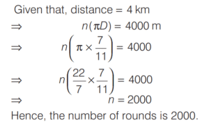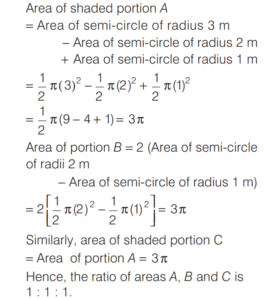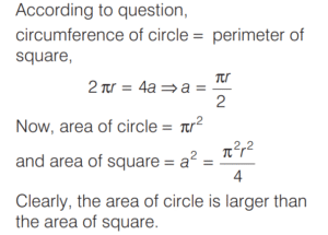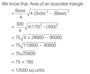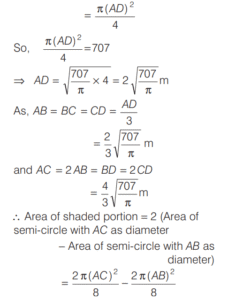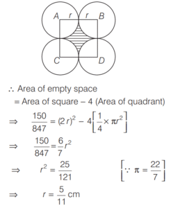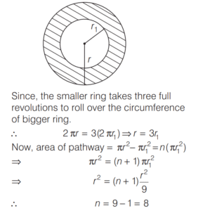AREA AND PERIMETER (CDS)Total Questions: 11671. A circle and a square have the same perimeter. Which one of the following is correct? [2016 (II) Evening Shift](a) Their areas are equal(b) The area of the circle is larger(c) The area of the square is π/2 times area of circle(d) The area of the square is π times area of circleCorrect Answer: (b) The area of the circle is largerSolution:Let r and a be the radius of a circle and side of a square respectively.72. In an equilateral triangle another equilateral triangle is drawn inside joining the mid-points of the sides of given equilateral triangle and the process is continued up to 7 times. What is the ratio of area of fourth triangle to that of seventh triangle? [2016 (II) Evening Shift](a) 256 : 1(b) 128 : 1(c) 64 : 1(d) 16 : 1Correct Answer: (c) 64 : 1Solution:Let the side of equilateral triangle be x.73. The area of four walls of a room is 120 m² . The length of the room is twice its breadth. If the height of the room is 4 m, what is area of the floor? [2016 (II) Evening Shift](a) 40 m²(b) 50 m²(c) 60 m²(d) 80 m²Correct Answer: (b) 50 m²Solution:Let l, b and hbe the length, breadth and height of the room. 74. AD is the diameter of a circle with area 707 m² and AB = BC = CD as shown in the figure. All curves inside the circle are semi-circles with their diameters on AD. What is the cost of levelling the shaded region at the rate of ₹63 per m²? [2016 (I) Morning Shift](a) ₹29700(b) ₹22400(c) ₹14847(d) None of theseCorrect Answer: (c) ₹14847Solution:Area of circle with diameter (AD) 75. A circle of 3 m radius is divided into three areas by semi-circles of radii 1 m and 2 m as shown in the figure. The ratio of the three areas A, B and C will be [2016 (I) Morning Shift](a) 2 : 3 : 2(b) 1 : 1 : 1(c) 4 : 3 : 4(d) 1 : 2 : 1Correct Answer: (b) 1 : 1 : 1Solution:Given a radius of 3 m is divided in such a way that the radius of smaller semi-circle is 1 m and radius of bigger semi-circle is 2 m. 76. A truck moves along a circular path and describes 100 m when it has traced out 36° at the centre. The radius of the circle is equal to [2016 (I) Morning Shift](a) 100/π m(b) 250/π m(c) 500/π m(d) 600/π mCorrect Answer: (c) 500/π mSolution:Let r be the radius of the circle.77. The number of rounds that a wheel of diameter 7/11 m will make in traversing 4 km will be [2016 (I) Morning Shift](a) 500(b) 1000(c) 1700(d) 2000Correct Answer: (d) 2000Solution:Number of rounds that a wheel of diameter D will make in traversing a distance = n D (π )78. The base of an isosceles triangle is 300 units and each of its equal sides is 170 units. Then, the area of the triangle is [2016 (I) Morning Shift](a) 9600 square units(b) 10000 square units(c) 12000 square units(d) None of the aboveCorrect Answer: (c) 12000 square unitsSolution:Here, base = 300 units and side = 170 units79. Four equal discs are placed such that each one touches two others. If the area of empty space enclosed by them is 150/847 sq cm, then the radius of each disc is equal to [2016 (I) Morning Shift](a) 7/6 cm(b) 5/6 cm(c) 7/2 cm(d) 5/11 cmCorrect Answer: (d) 5/11 cmSolution:Let the radius of the circle be r. Then, side of square ABCD = 2r80. A circular path is made from two concentric circular rings in such a way that the smaller ring when allowed to roll over the circumference of the bigger ring, takes three full revolutions. If the area of the pathway is equal to n times the area of the smaller ring, then n is equal to [2016 (I) Morning Shift](a) 4(b) 6(c) 8(d) 10Correct Answer: (c) 8Solution:Let the radius of smaller ring be r₁ and the radius of bigger ring be r.Submit Quiz« Previous123456789101112Next »