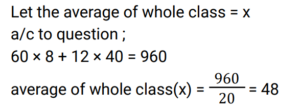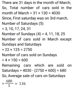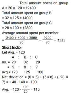 Average (Railway Maths) (Part – I)Total Questions: 5031. The total expenditure of Krishna in a year is ₹4,20,000. If his salary per month is ₹45,000, then find his average savings per month. [Group D 08/09/2022 (Morning) ](a) ₹16,000(b) ₹10,000(c) ₹12,000(d) ₹14,000Correct Answer: (b) ₹10,000Solution:32. The average sale of cars by a dealer per day in the month of March, other than on Saturdays and Sundays, is 125. The average sale of cars per day on Sundays is 150. What is the average sale of cars per day on Saturdays, if the first Saturday is on the 3rd of March and average sale of cars per day for the whole month is 130? [Group D 08/09/2022 (Evening) ](a) 140(b) 136(c) 132(d) 138Correct Answer: (b) 136Solution:33. There are 20 members in group A, 32 members in group B and 28 members in group C. All the members of these groups went to a restaurant. The average amount spent on each member of group A, B and C is ₹120, ₹125 and ₹100, respectively. The total average amount (in ₹) spent per member is: [Group D 08/09/2022 (Evening)](a) 115(b) 118(c) 116(d) 112Correct Answer: (a) 115Solution:34. A class of 20 students took a science test. 8 students had an average (arithmetic mean) score of 60. The remaining students had an average score of 40. The average score of the whole class is: [Group D 12/09/2022 (Morning)](a) 68(b) 48(c) 58(d) 40Correct Answer: (b) 48Solution:35. The average of the prime numbers between 11 and 30 is: [Group D 12/09/2022 (Afternoon)](a) 19.6(b) 20.2(c) 19.5(d) 20.3Correct Answer: (b) 20.2Solution:36. The average of 41 numbers is 62. The average of the first 18 numbers is 65.5 and the average of the last 24 numbers is 61.5. If the 18th number from the beginning is excluded, then what is the average of the remaining numbers? [Group D 12/09/2022 (Afternoon)](a) 60.725(b) 61.625(c) 60.5(d) 61.325Correct Answer: (a) 60.725Solution:37. The average of 3², 4², 5², 6² and 7² is ________. [Group D 14/09/2022 (Evening)](a) 24(b) 27(c) 28(d) 25Correct Answer: (b) 27Solution:38. The average of the first 35 natural numbers is ________. [Group D 15/09/2022 (Afternoon)](a) 18.5(b) 17.5(c) 17(d) 18Correct Answer: (d) 18Solution:39. The average weight of 6 persons increases by 2 kg when one of them whose weight is 72 kg is replaced by a new man.The weight of the new man is: [Group D 16/09/2022 (Morning) ](a) 74 kg(b) 84 kg(c) 104 kg(d) 94 kgCorrect Answer: (b) 84 kgSolution:40. The average weight of 32 parcels was recorded as 96 kg. If the weight of one more parcel is included, the average is increased by 2 kg. The weight of the new parcel is: [Group D 16/09/2022 (Afternoon) ](a) 192 kg(b) 162 kg(c) 182 kg(d) 172 kgCorrect Answer: (b) 162 kgSolution:Submit Quiz« Previous12345Next »
