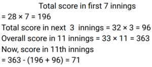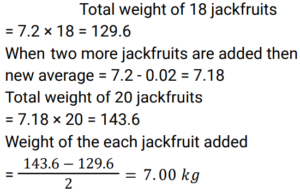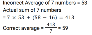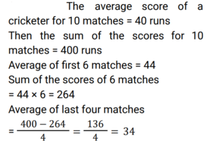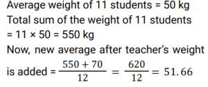 Average (Railway Maths) (Part – I)Total Questions: 5041. The average weight of 11 students is 50 kg. When the teacher's weight of 70 kg is added to the total, then the new average weight will be: [Group D 18/09/2022 (Evening)](a) 50.66(b) 53.66(c) 51.36(d) 51.66Correct Answer: (d) 51.66Solution:42. The average score of a cricketer for 10 matches is 40 runs. If the average for the first six matches is 44, then the average runs of the last four matches is: [Group D 18/09/2022 (Evening)](a) 20(b) 38(c) 42(d) 34Correct Answer: (d) 34Solution:43. At a health club, 80% of the members are men and the remaining 20% are women. The average age of the male members is 30 years and the average age of the female members is 40 years. The combined average age of all the members of this health club is ____ years. [Group D 19/09/2022 (Afternoon)](a) 35(b) 31(c) 33(d) 32Correct Answer: (d) 32Solution:44. The mean weight of 18 jackfruits is 7.2 kg. If the weights of 2 more jackfruits whose weights are equal are added, the mean weight decreases by 20 gm. What is the weight of each jackfruit added later? [Group D 22/09/2022 (Evening)](a) 7.18 kg(b) 7.22 kg(c) 7.00 kg(d) 7.40 kgCorrect Answer: (c) 7.00 kgSolution:45. The average score of a cricketer in his first 7 innings is 28 runs. His average score in the next 3 innings is 32 runs. Determine the score he should get in his 11th inning so that his overall average score becomes 33 runs. [Group D 27/09/2022 (Evening)](a) 55(b) 50(c) 49(d) 71Correct Answer: (d) 71Solution:46. The average of 7 numbers was given as 53. Later it was found that one number was misread as 68 instead of 58. What is the correct average of the given 7 numbers? [Group D 29/09/2022 (Evening)](a) 52(b) 55(c) 59(d) 56Correct Answer: (c) 59Solution:47. Vishnu purchased 8000 products for ₹1.2 each, another 3000 products for ₹1.5 each and another 5000 products for ₹1.4 each. Find the average cost per product. (Round the answer to two decimal places.) [Group D 29/09/2022 (Evening) ](a) ₹1.27(b) ₹1.39(c) ₹1.41(d) ₹1.32Correct Answer: (d) ₹1.32Solution:48. A study centre has 5 classes with 50, 60, 25, 40 and 70 students. The pass percentage of these 5 classes are 20%, 25%, 20%, 10%, 30%, respectively. Find the average number of students per class in the centre who passed. [Group D 06/10/2022 (Evening)](a) 10(b) 12(c) 11(d) 55Correct Answer: (c) 11Solution:49. The mean of the first 7 prime numbers is: [Group D 11/10/2022 (Morning)](a) 58/7(b) 63/7(c) 75/7(d) 50/7Correct Answer: (a) 58/7Solution:50. A class consisting of 30 students took a competitive exam. 18 of these students got an average of 90 marks and the remaining students of this class got an average of 80 marks. What is the average score of the class as a whole? [Group D 11/10/2022 (Afternoon)](a) 92(b) 76(c) 86(d) 82Correct Answer: (c) 86Solution:Submit Quiz« Previous12345