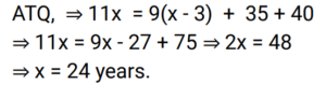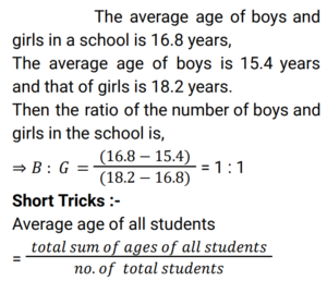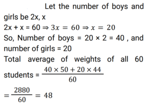 Average (Railway Maths) (Part – II)Total Questions: 5011. Find the average of 45% of 70 and 35% of 110. [Level 5 (15/06/2022) Shift 2 ](a) 34.5(b) 35(c) 37.5(d) 35.5Correct Answer: (b) 35Solution:12. Consider a sequence of seven consecutive numbers. If the average of the first five numbers is ‘z’ , then find the average of the last three numbers. [Level 2 (16/06/2022) Shift 2 ](a) z + 5(b) z + 1(c) z + 7(d) z + 3Correct Answer: (d) z + 3Solution:13. Team India scored runs in the first 30 overs in an ODI match at an average of 5.6 runs per over. What is the required runs per over in the remaining 20 overs at which the team has to score to meet a total target of 320? [Level 3 (17/06/2022) Shift 2 ](a) 8.9 runs per over(b) 6.4 runs per over(c) 7.6 runs per over(d) 4.6 runs per overCorrect Answer: (c) 7.6 runs per overSolution:14. Out of 60 students in a group, the ratio of the number of boys to that of girls is 2 : 1. If the average weight of boys is 50 kg and that of girls is 44 kg, then what is the average weight (in kg) of all the students in the group? [Level 3 (17/06/2022) Shift 2 ](a) 48.25(b) 47.5(c) 49(d) 48Correct Answer: (d) 48Solution:15. In a school the average age of boys and girls together is 16.8 years. The average age of boys is 15.4 years, and the average age of girls is 18.2 years. The ratio of number of boys to girls in the school is: [RRB NTPC 28/12/2020 (Evening)](a) 2 : 3(b) 1 : 1(c) 3 : 2(d) 3 : 5Correct Answer: (b) 1 : 1Solution:16. Out of three numbers, the first number is twice of the second and thrice of the third number. If the average of the three numbers is 880, what is the smallest number? [RRB NTPC 30/12/2020 (Evening)](a) 480(b) 840(c) 460(d) 420Correct Answer: (a) 480Solution:17. The average weight of P, Q and R is 58 kg. If the average weight of P and Q is 54 kg and that of Q and R is 48 kg, then the weight of Q is: [RRB NTPC 04/01/2021 (Evening)](a) 26 kg(b) 32 kg(c) 30 kg(d) 28 kgCorrect Answer: (c) 30 kgSolution:18. The captain of a cricket team of 11 members is 35 years old and the wicket keeper is 5 years older than the captain. If the ages of these two are excluded, the average age of the remaining players is three years less than the average age of the whole team. What is the average age of the whole team? [RRB NTPC 04/01/2021 (Evening)](a) 24 years(b) 28 years(c) 26 years(d) 25 yearsCorrect Answer: (a) 24 yearsSolution:19. At present the average age of 20 students of class ten is 15.5 years. The present age of the class teacher is 47 years. What will be the average age of the students and the class teacher after 5 years? [RRB NTPC 08/01/2021 (Morning) ](a) 22 years(b) 21.8 years(c) 21.5 years(d) 22.5 yearsCorrect Answer: (a) 22 yearsSolution:20. The average weight of A, B, C and D is 56 kg. If the average weight of A, B and C is 52 kg and that of C and D is 48 kg. Then the weight of C is? [RRB NTPC 08/01/2021 (Evening) ](a) 30 kg(b) 36 kg(c) 28 kg(d) 34 kgCorrect Answer: (c) 28 kgSolution:Submit Quiz« Previous12345Next »