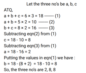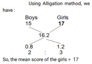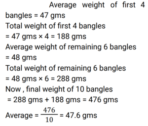 Average (Railway Maths) (Part – III)Total Questions: 3521. In a support project of an English based company, there are 513 male and 513 female employees.The average productivity of all employees is 63 calls per day. The average call organized by the male employee is 63 calls per day. What is the average call per day by female employees? [RPF S.I. 06/01/2019 (Morning) ](a) 63(b) 61(c) 67(d) 65Correct Answer: (a) 63Solution:22. There are 10 bangles in a gift box, the first four bangles have an average weight of 47 grams and the remaining 6 bangles have an average weight of 48 grams. Find the average weight of the total bangles. (In grams) [RPF S.I. 06/01/2019 (Afternoon) ](a) 47.6(b) 45.6(c) 46.6(d) 48.6Correct Answer: (a) 47.6Solution:23. A gift box has 10 bangles. The average weight of the first four bangles is 49 gms and the remaining weight of the 6 bangles is 50 gms. Tell the average weight of all bangles. (in grams) [RPF S.I. 10/01/2019 (Morning)](a) 49.6(b) 49.4(c) 49.7(d) 49.5Correct Answer: (a) 49.6Solution:24. The average weight of 63 notebooks kept in a box is 6.3 kg. When a new notebook is placed in the box then the average is 6.4 kg. Specify the weight of the new notebook. (In Kg) [RPF S.I. 10/01/2019 (Morning)](a) 12.7(b) 12.5(c) 12.1(d) 12.3Correct Answer: (a) 12.7Solution:25. The mean score in a test of the 10 boys in a class was 15 while the overall mean of the 25 students in the class was 16.2. What was the mean score of the girls? [RRB ALP 13/08/2018 (Morning)](a) 16.8(b) 17(c) 17.5(d) 16.5Correct Answer: (b) 17Solution:26. Samit was given some money to take care of his travel during a 6-day sales drive he had to undertake. However, he had to increase his stay by another 4 days and as a result his average daily travel allowance went down by ₹ 56. What was the amount that was sanctioned to him in the beginning? [RRB ALP 13/08/2018 (Morning)](a) ₹420(b) ₹336(c) ₹840(d) ₹560Correct Answer: (c) ₹840Solution:27. The average of three numbers is 6. The average of the first two is 5 while the average of the last two is 8. The three numbers are: [RRB ALP 13/08/2018 (Afternoon)](a) 2, 7, 9(b) 2, 6, 10(c) 2, 8, 8(d) 3, 7, 8Correct Answer: (c) 2, 8, 8Solution:28. There was a group of six students who took a test. Another student joined the group after taking the test later. With her marks included the average score of the group went up by 3. This student has got ________ marks more than the average marks without her being included. [RRB ALP 13/08/2018 (Evening)](a) 21(b) 20(c) 18(d) 24Correct Answer: (a) 21Solution:29. What is the mean of first hundred natural numbers? [RRB ALP 14/08/2018 (Afternoon)](a) 50(b) 51.5(c) 50.5(d) 51Correct Answer: (c) 50.5Solution:30. Four numbers A, B, C and D are such that their overall average is 16. The average of A and B is 9.5. The average of C and D is: [RRB ALP 17/08/2018 (Morning) ](a) 22.5(b) 23(c) 25.5(d) 21.5Correct Answer: (a) 22.5Solution:Submit Quiz« Previous1234Next »