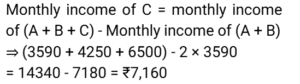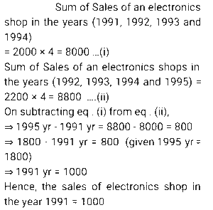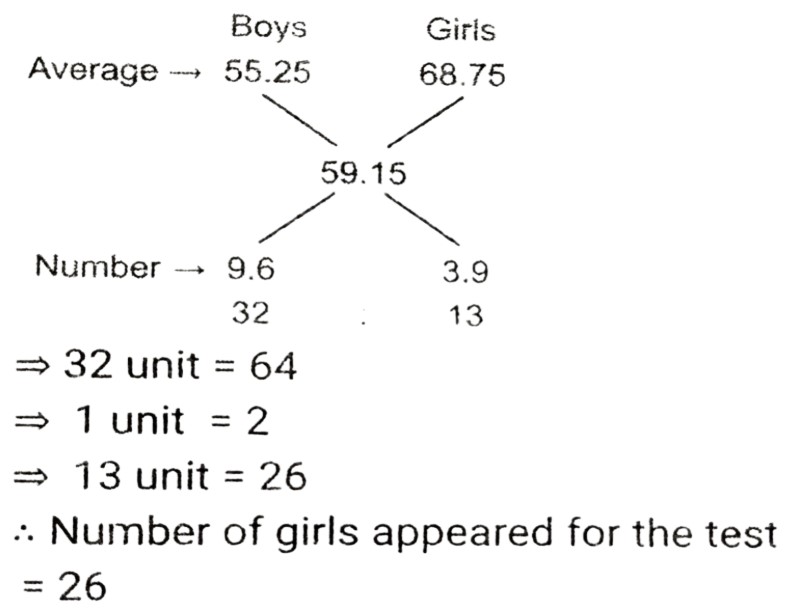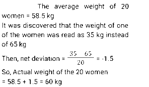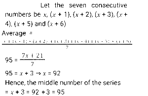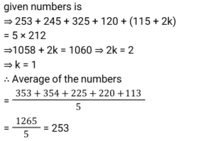 Average (SSC) (Part-2)Total Questions: 5021. The average monthly income of A and B is ₹3,590. The average monthly income of B and C is ₹4,250. The average monthly income of A and C is ₹6,500. What is the monthly income of C? [SSC MTS 30/09/2024 (Morning)](a) ₹7,545(b) ₹6,984(c) ₹8,190(d) ₹7,160Correct Answer: (d) ₹7,160Solution:22. The average of the sales of an electronics shop in the years 1991, 1992, 1993 and 1994 is 2000, and that for the years 1992, 1993, 1994 and 1995 is 2200. If the sales in 1995 are 1800, find the sales in 1991. [SSC MTS 30/09/2024 (Afternoon)](a) 800(b) 1200(c) 1000(d) 500Correct Answer: (c) 1000Solution:23. The average of the numbers 253, 245, 325, 120 and 115+2K is 212. Find the average of the numbers 353, 354, 225, 220 and 110+3K. [SSC MTS 30/09/2024 (Evening)](a) 252(b) 250(c) 253(d) 251Correct Answer: (c) 253Solution:24. The average score obtained by 64 boys and a certain number of girls in a test is 59.15, while the average score obtained by the boys is 55.25. If the average score of the girls is 68.75, then how many girls appeared for the test ? [SSC MTS 30/09/2024 (Evening)](a) 27(b) 28(c) 25(d) 26Correct Answer: (d) 26Solution:25. The average weight of a certain number of students in a group was 72 kg. If 11 students, with an average weight of 76 kg each, leave the group, and 5 students, each with an average weight of 79 kg, join the group, the average weight of the students in the group decreases by 0.6 kg. The number of students initially in the group was: [SSC MTS 01/10/2024 (Morning)](a) 21(b) 25(c) 17(d) 19Correct Answer: (a) 21Solution:26. The average weight of a group of 20 women was calculated as 58.5 kg and it was later discovered that the weight of one of the women was read as 35 kg, whereas her actual weight was 65 kg. What is the actual average weight of the group of 20 women? [SSC MTS 01/10/2024 (Afternoon)](a) 70 kg(b) 40 kg(c) 60 kg(d) 50 kgCorrect Answer: (c) 60 kgSolution:27. The average of seven consecutive numbers is 95. Find the middle number in the series of seven consecutive numbers. [SSC MTS 07/10/2024 (Afternoon)](a) 98(b) 96(c) 92(d) 95Correct Answer: (d) 95Solution:28. The average age of 11 players of a cricket team is increased by 2 months, when two of them aged 20 years and 21 years, respectively, are replaced by two new players. Find the average age of the two new players (in years). [SSC MTS 08/10/2024 (Morning)](a) 181⁵⁄₁₂(b) 21⁵⁄₁₂(c) 18¼(d) 20½Correct Answer: (b) 21⁵⁄₁₂Solution:29. A tunnel elevator can carry a maximum of 15 passengers with an average weight of 81 kg. However, four persons beyond the maximum capacity entered the elevator, resulting in an average weight of 82 kg and causing it to be overloaded. Find the average weight (in kg) of the additional four persons. [SSC MTS 08/10/2024 (Afternoon)](a) 90.41(b) 100(c) 102.37(d) 85.75Correct Answer: (d) 85.75Solution:30. The mean of marks secured by 3 students in grade A of class XI is 83, that of 4 students of grade B is 76 and that of 5 students of grade C is 85. What will be the mean of marks of the students of three grades of Class XI ? [SSC MTS 08/10/2024 (Evening)](a) 80.5(b) 81(c) 80(d) 81.5Correct Answer: (d) 81.5Solution:Submit Quiz« Previous12345Next »